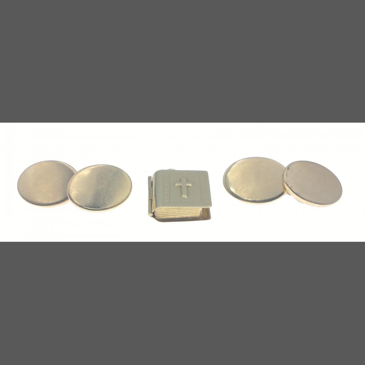 A 375 hallmarked bible charm 2.30g and a pair of gilt oval cufflinks