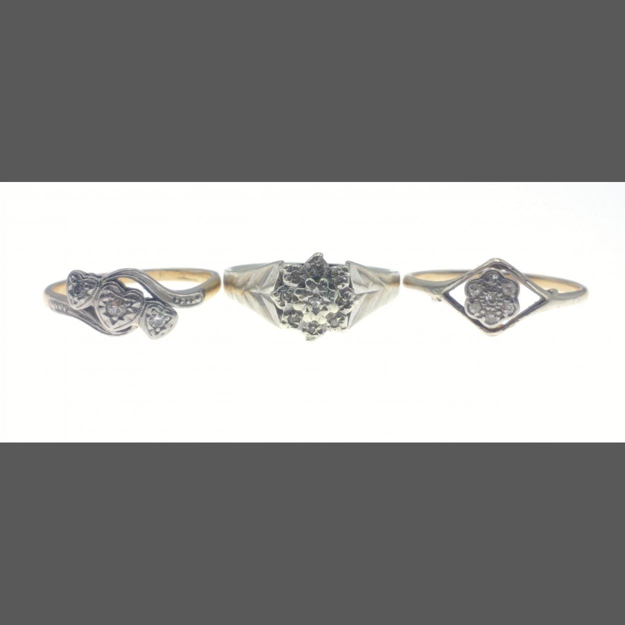 Three 9ct rings to include a small floral set diamond size N, a three stone heart set ring size L and an illusion set floral style size N gross weight 7.15g