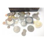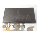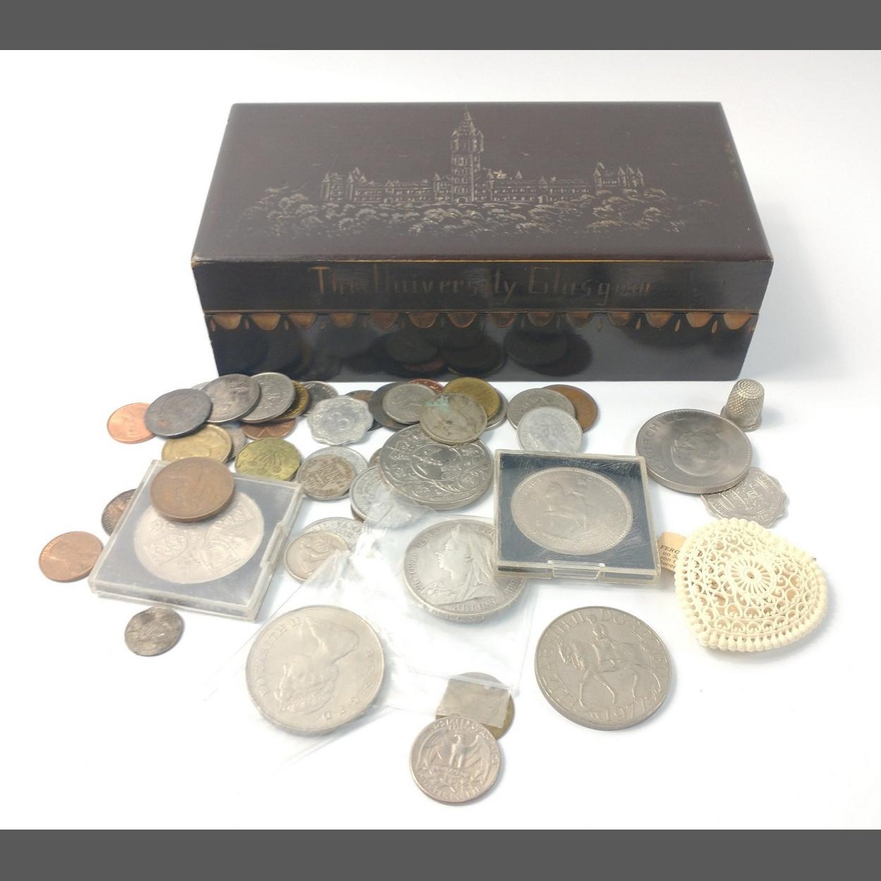 The University of Glasgow engraved wooden box 19x10x6cm containing coins to include commemorative 1953 5 shillings, Charles & Diana 1981 coin and an 1894 Victorian commemorative coin etc