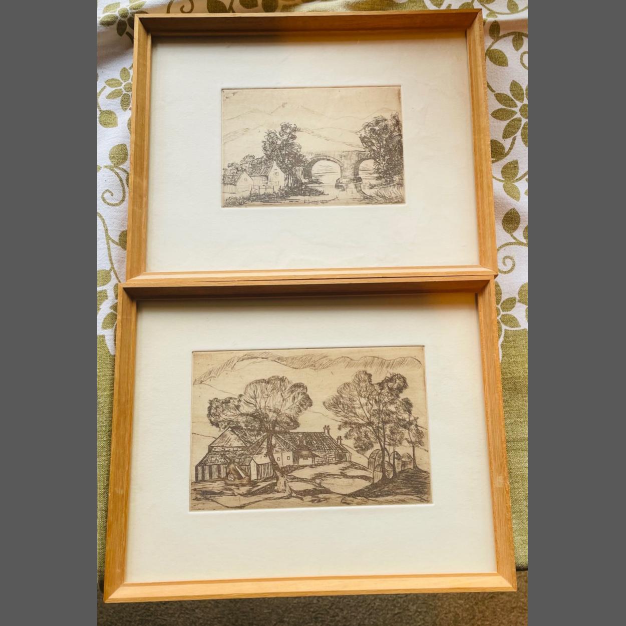 Two VINTAGE pencil RURAL SKETCHES 15cm x 10cm x 13cm x 8cm approx