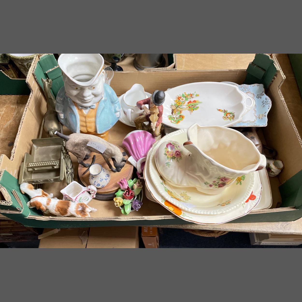 A mixed box of decorative items to include a pearlescent toby jug, a brass horse and carriage etc