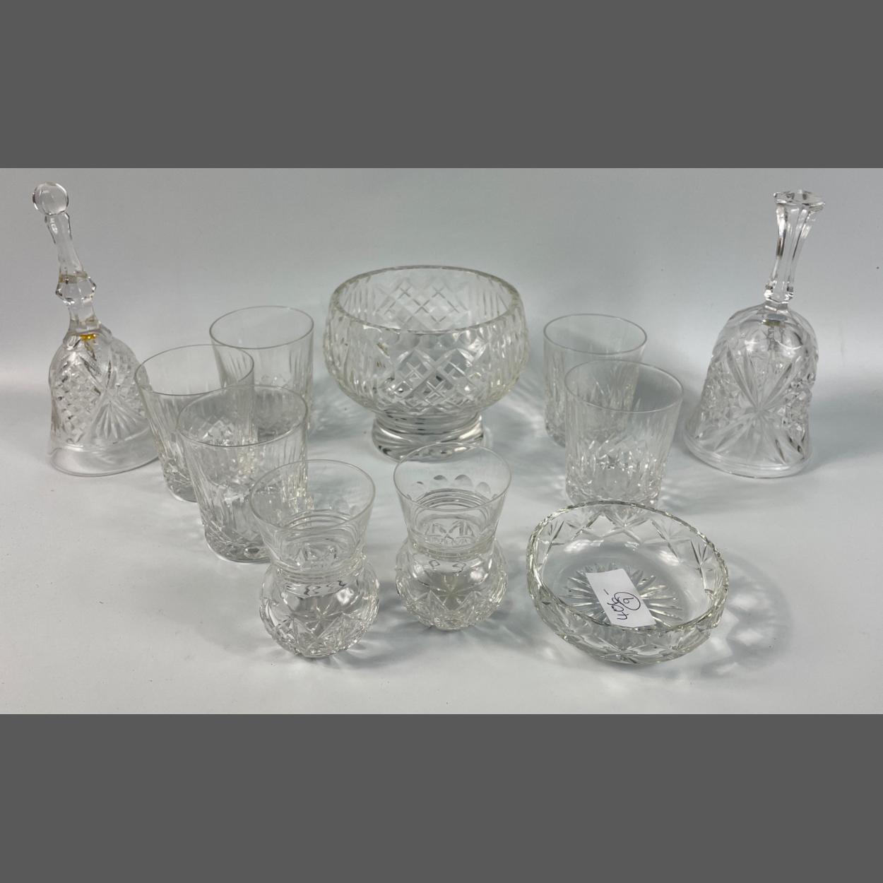 A small collection of crystal to include a rose bowl (12cm dia, 11cm high), 5 small whisky tumblers, 2 bells, a trinket dish (9cm dia approx) and 2 thistle shaped glasses