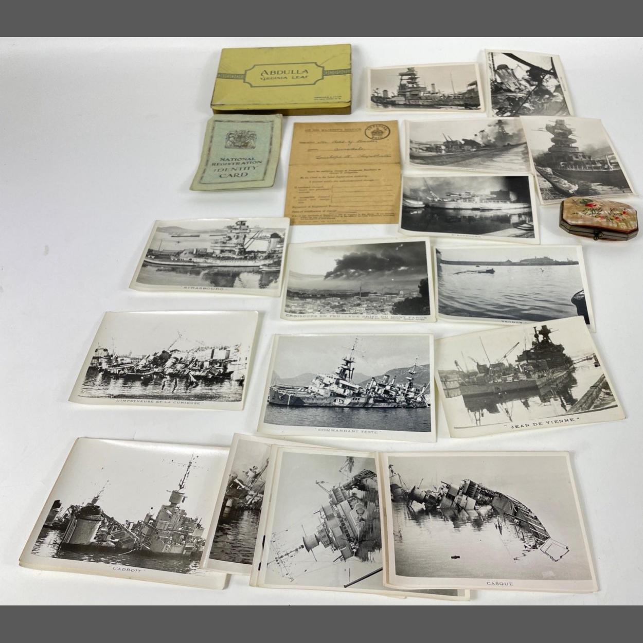 A nice vintage mother of pearl style purse complete with the small note 'I always like small change in my purse' hand written with coinage, also a National Identity card for Robert Hunter Skermorlie(Ayrshire), and a National registration card for a Radio Operator 1914, with also some mass produced photographs showing WWl Naval battleships mostly French sunken or scuttled to include The Foch Colbert, Marseillaise, Algerie, Strasbourg, Verdun, Jean De Vienne, Commandant Teste, Casque, TartuMameluk, VoltaLe Gladiateur and lots more!