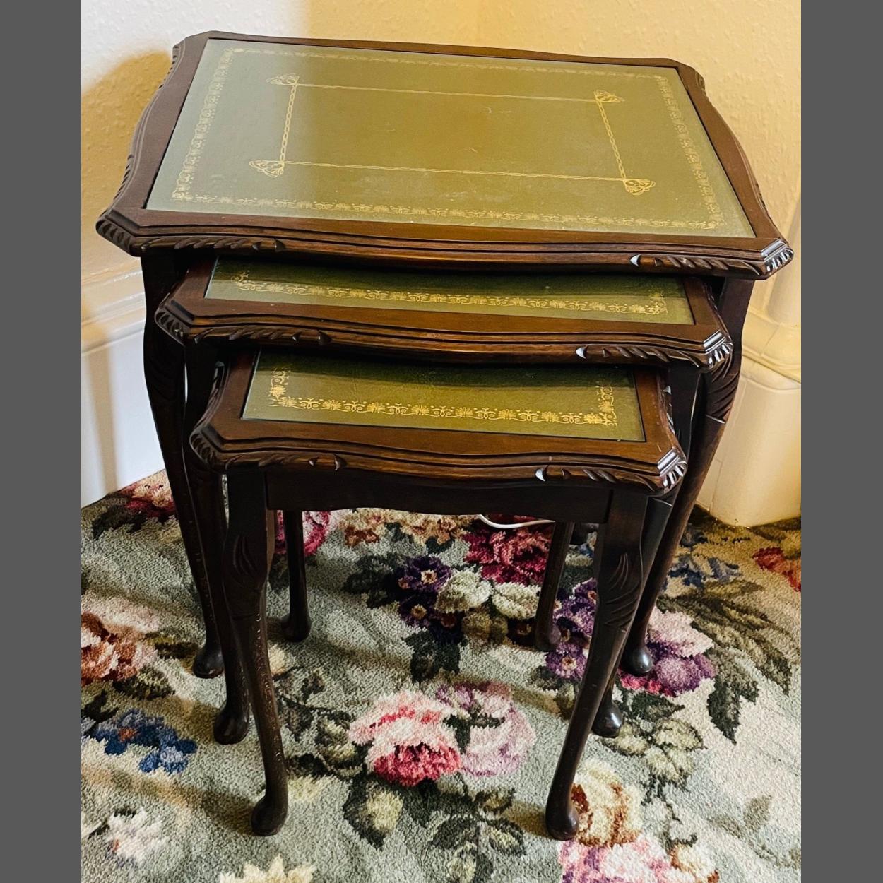 A nest of tables with green leather style tops with glass - dimensions largest table width 56cm x depth 42cm x height 56cm