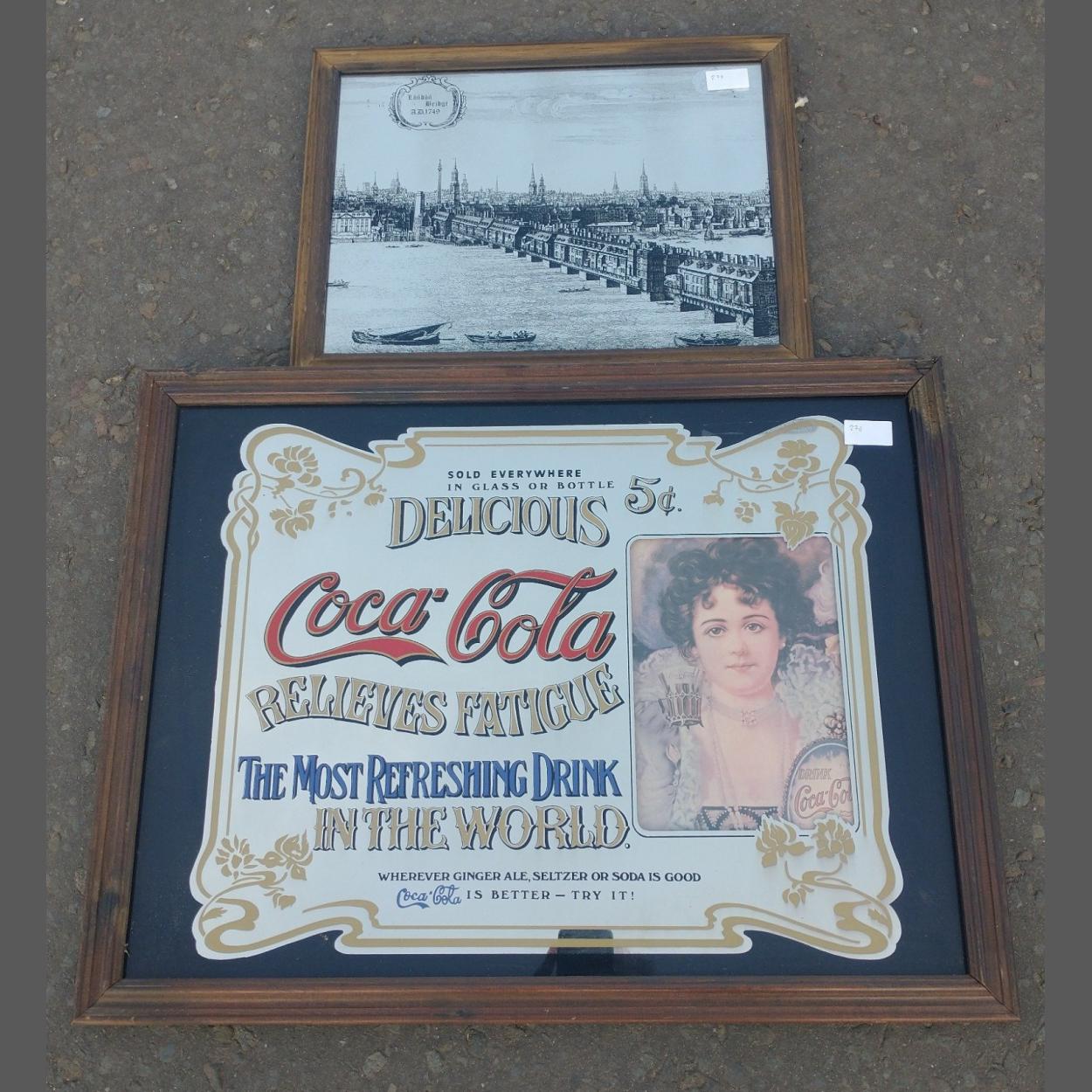 Two examples of mirror wall art the first being a view of London Bridge as it was in 1749 45x35cm approx, the second advertising COCA-COLA 66x50cm