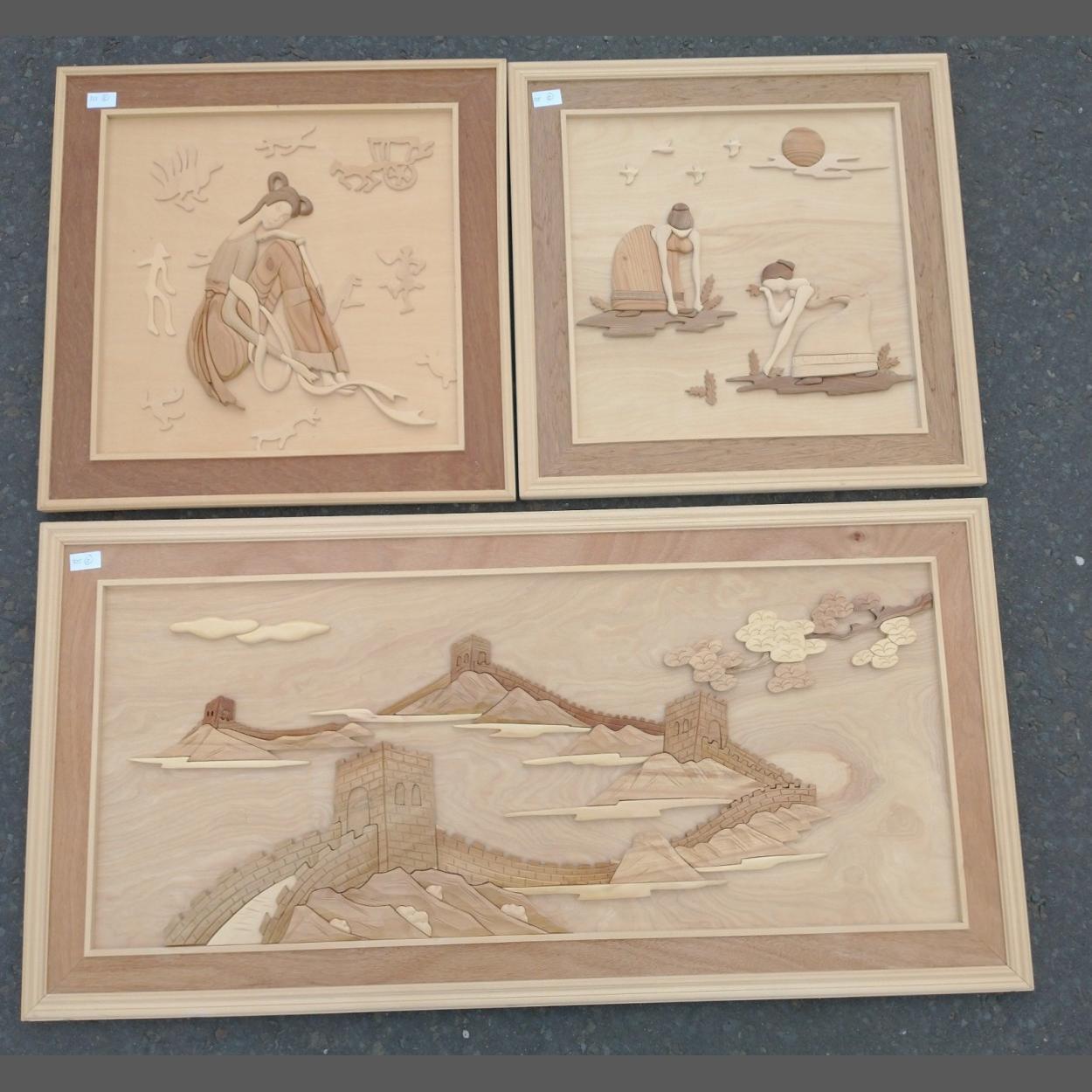 A collection of ORIENTAL scene framed pictures to scenes from a Paddy field, The Great Wall Of China and a GEISHA girl scene - all made from handcarved types of wood, really UNUSUAL - two smaller frames dimensions 60cm x 60cm and the other larger one 120cm length x 60cm height