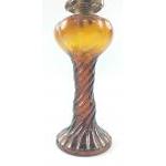 An UNUSUAL ANTIQUE brown glass reservoir oil lamp c1920's, the brown glass stem is in twisted form with a clear glass funnel, the wick is in place ready for use!