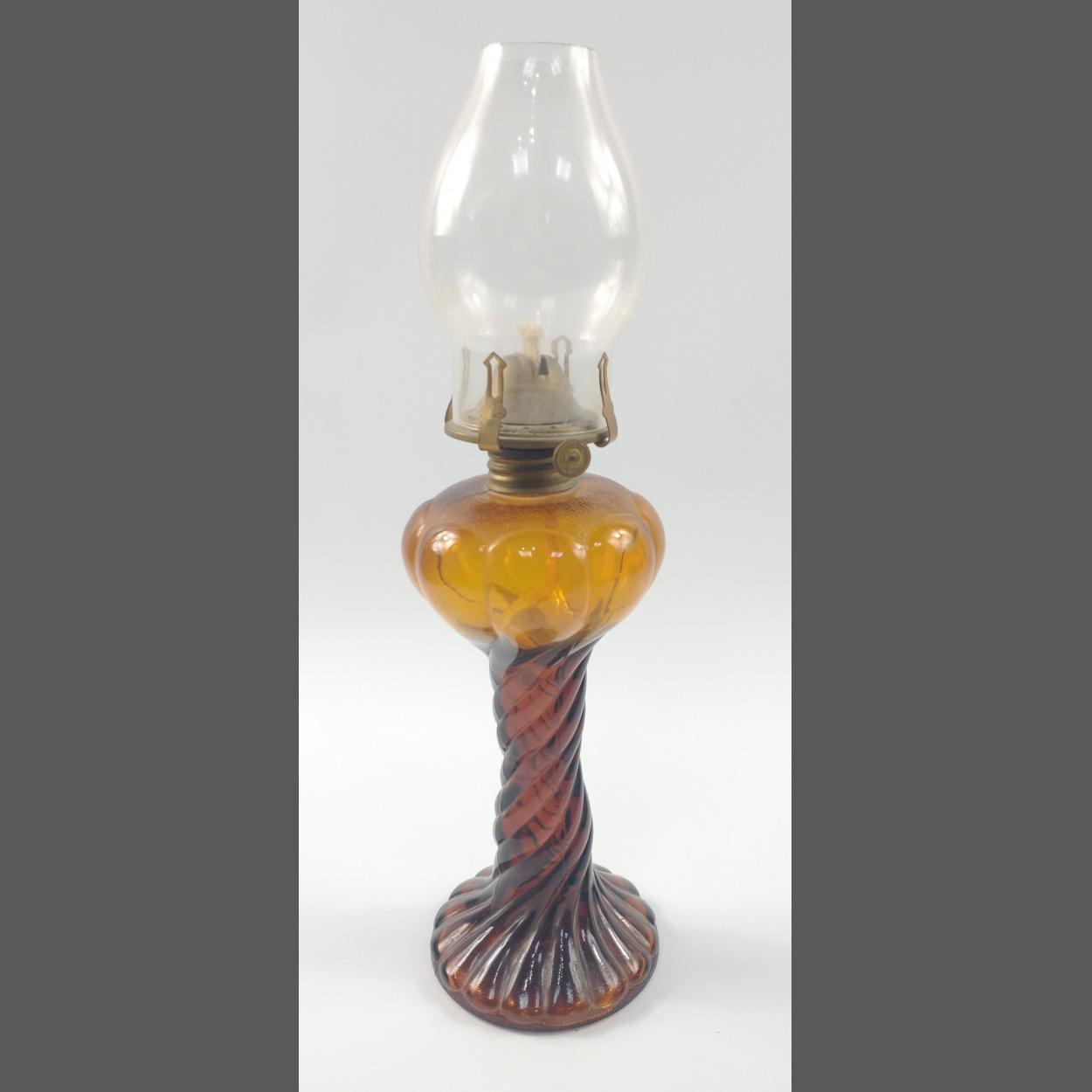 An UNUSUAL ANTIQUE brown glass reservoir oil lamp c1920's, the brown glass stem is in twisted form with a clear glass funnel, the wick is in place ready for use!