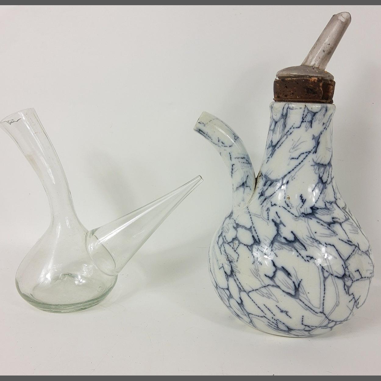 RARE! A vintage version of DR.NELSON'S IMPROVED INHALER manufactured by S Maw & Son Aldersgate St London (1900s - 1918), a white glazed ceramic bottle with wide hollow spout extending from a dome shaped body with a cork fitted with a glass tube running through the centre inserted into the neck opening of the bottle, still in use today to alleviate chest infections as well as by singers and actors prior to performance, stands 26cm high plus a two-necked glass flask 18cm tall