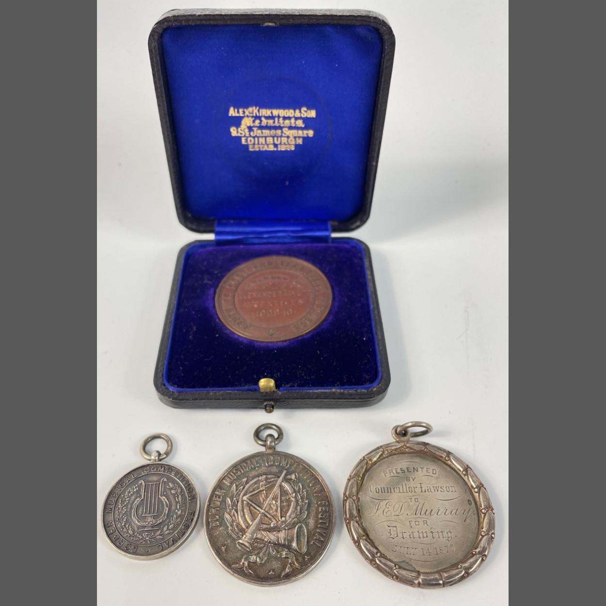 A VINTAGE REWARDING MUSICAL LOT! a 1924 silver Hallmarked for Brass Quartette William Rorrison weight 9.40g approx, with also a Silver Hallmarked Brass Quartette award medal 1922 weight 18.04g approx and also a 'white metal' medal for drawing Teviot Grove Acedemy presented by Councillor Lawson 1875 weight 13.47g approx and lastly a Soth Of Scotland Technical College 1909-1910