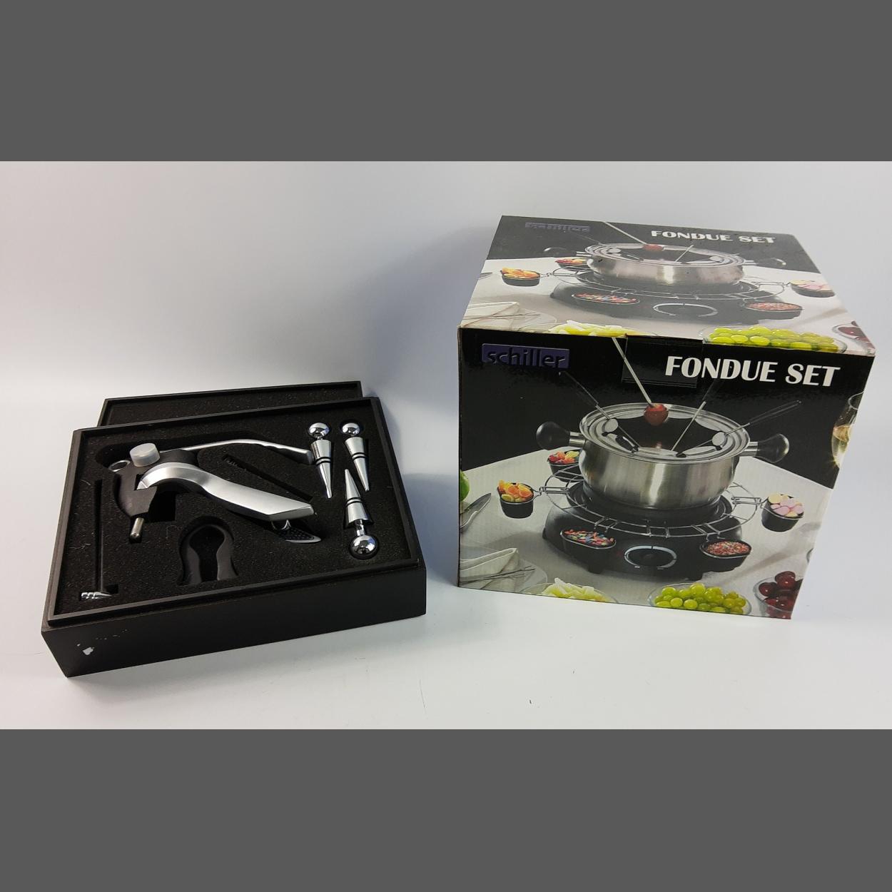 Ready for a convivial evening - an unused SCHILLER fondue set for six and a boxed corkscrew set complete with thermometer and bottle stoppers
