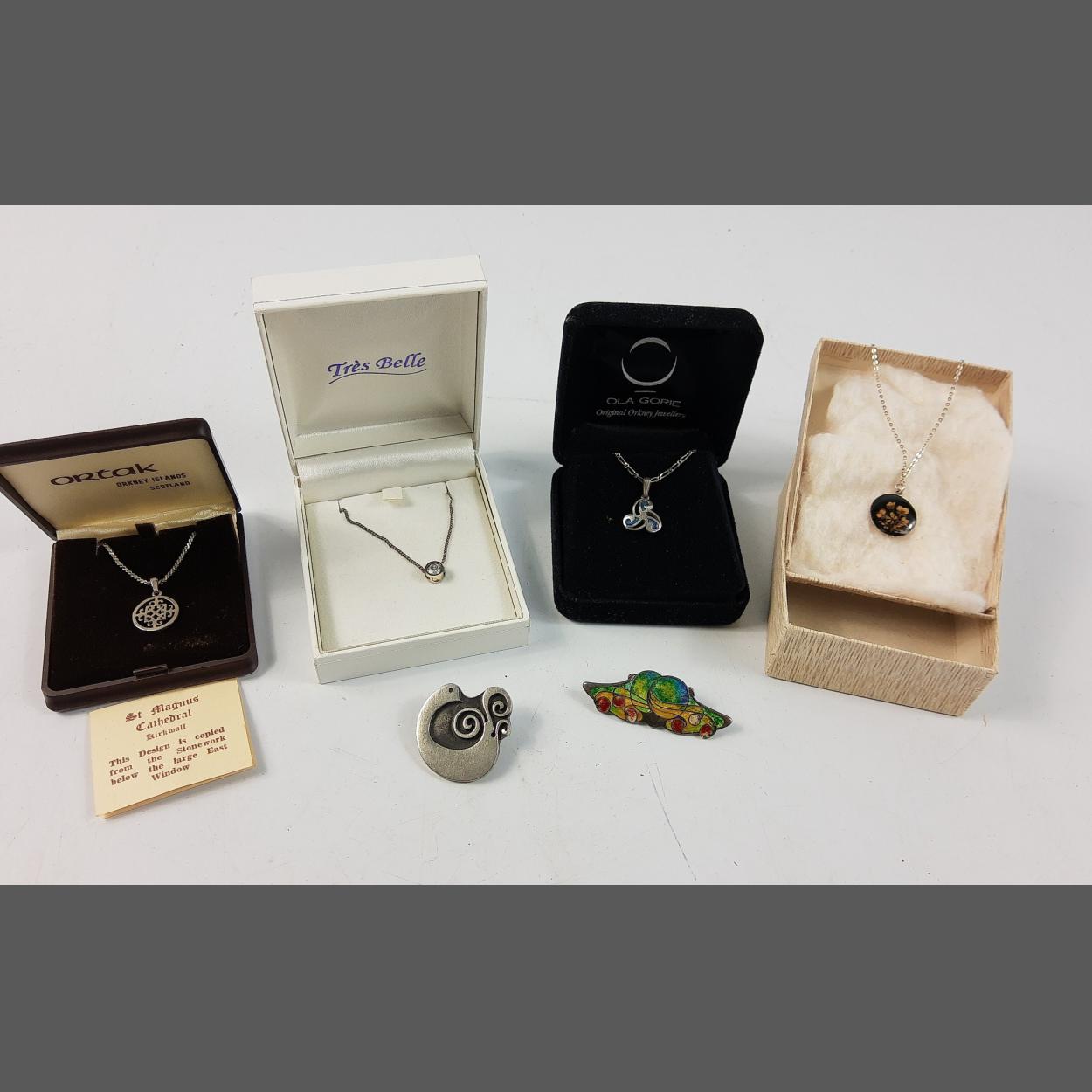 An OLA GORIE pendant (2cm) and chain (38cm approx), a flower pendant (2cm) and chain (40cm), a cloisonné brooch stamped silver (5cm long), a pewter brooch (3cm) by R TENNESMED of Sweden etc