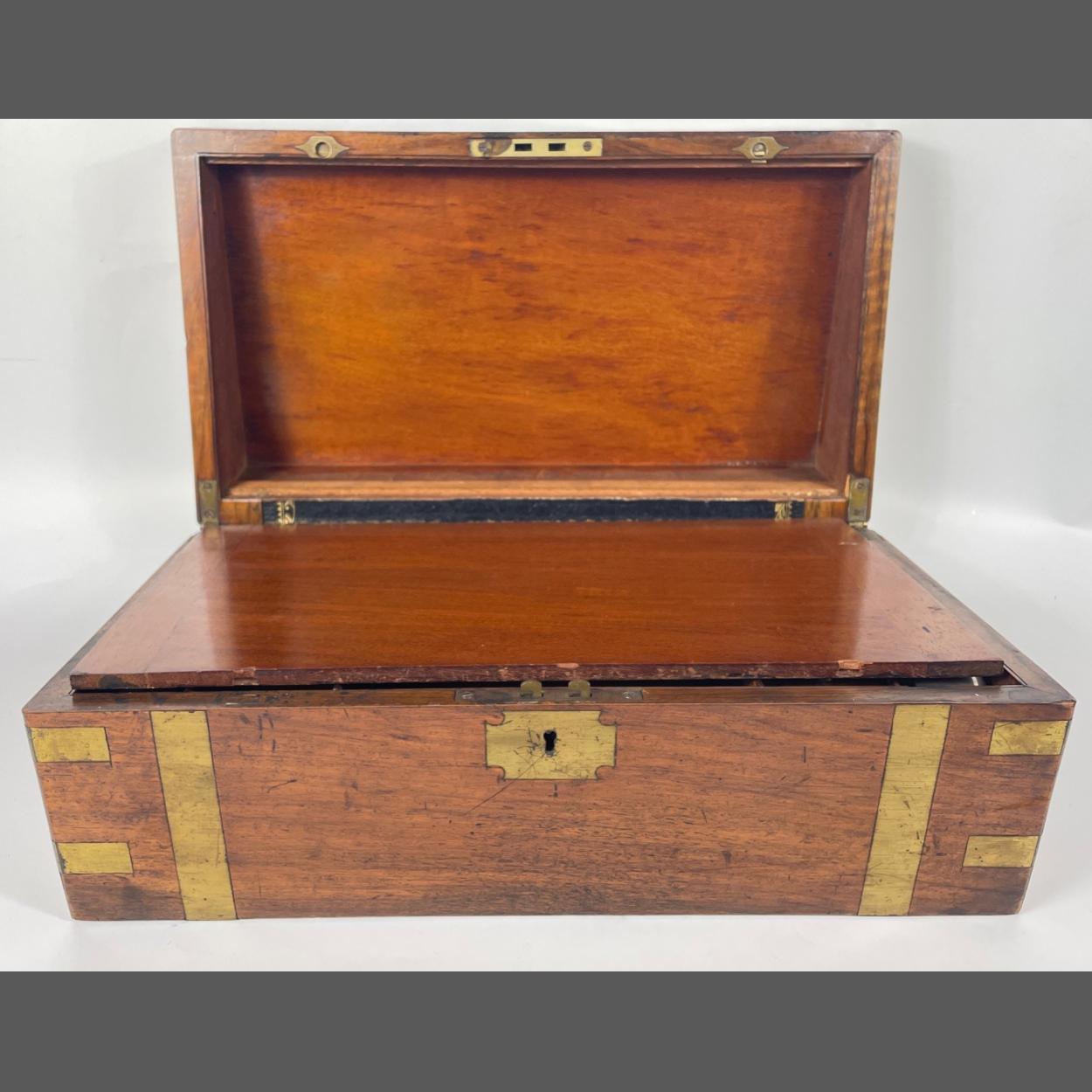 An ANTIQUE brass-bound wooden writing box 45x25x17cm given by the Glasgow Foundry Boys Religious Society (Rottenrow Branch) to Mr James Paton in 1891, comes with original inkwells (have some damage) and hidden drawer, the writing slope needs to be re-attached