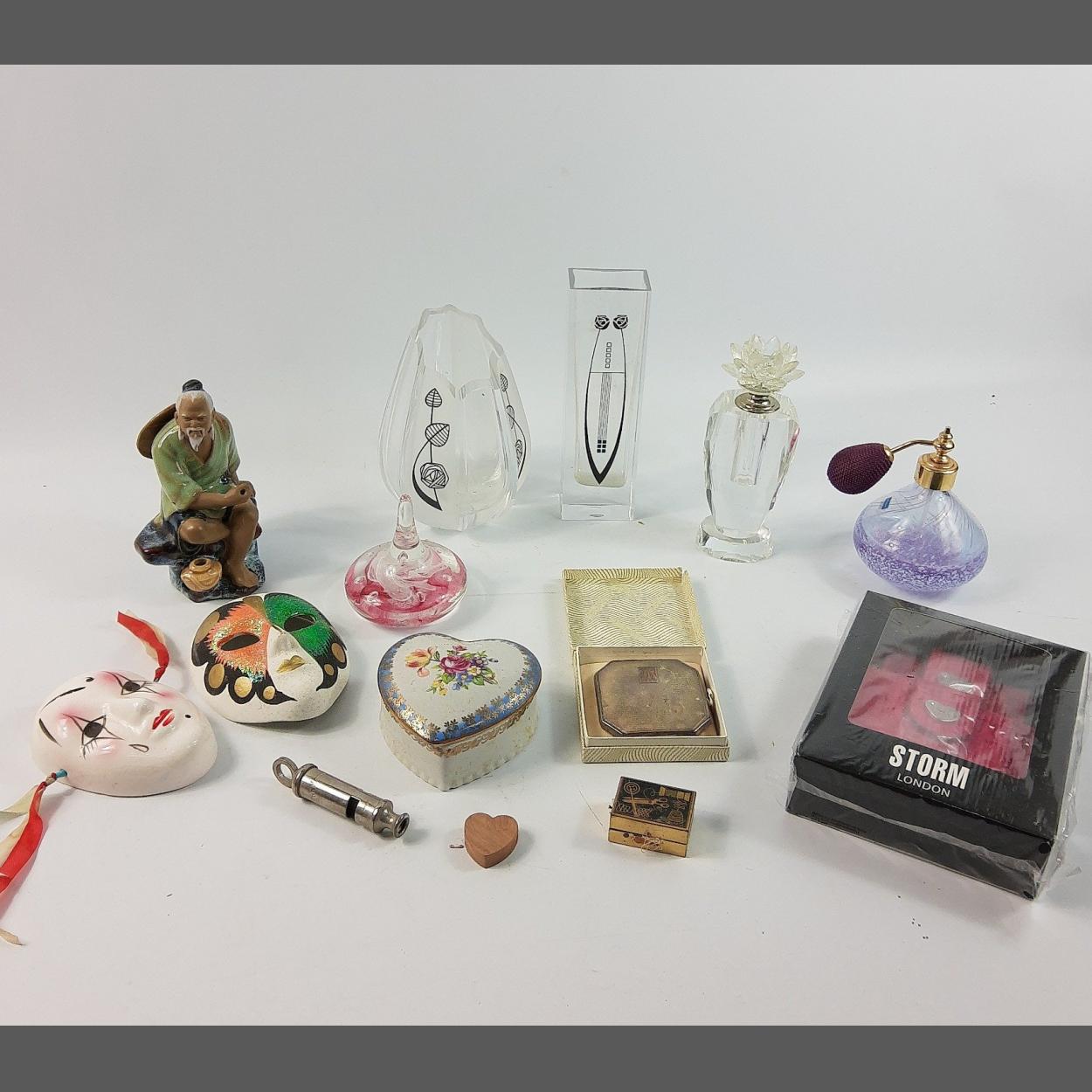 Assorted box containing glass vases, a CAITHNESS atomiser, a mudman figurine, etc