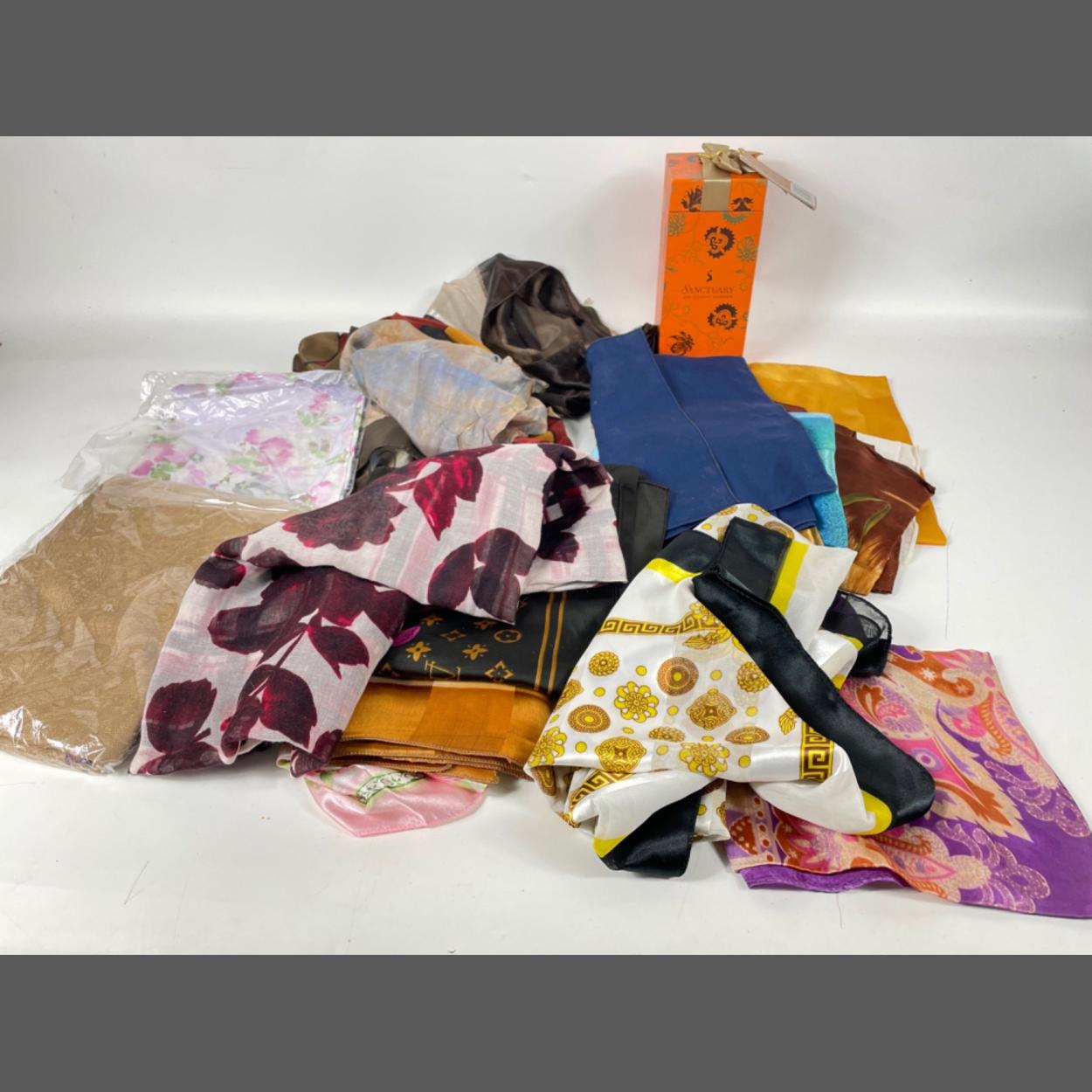 A large quantity of assorted scarves and headsquares and a SANCTUARY overnight pampering box