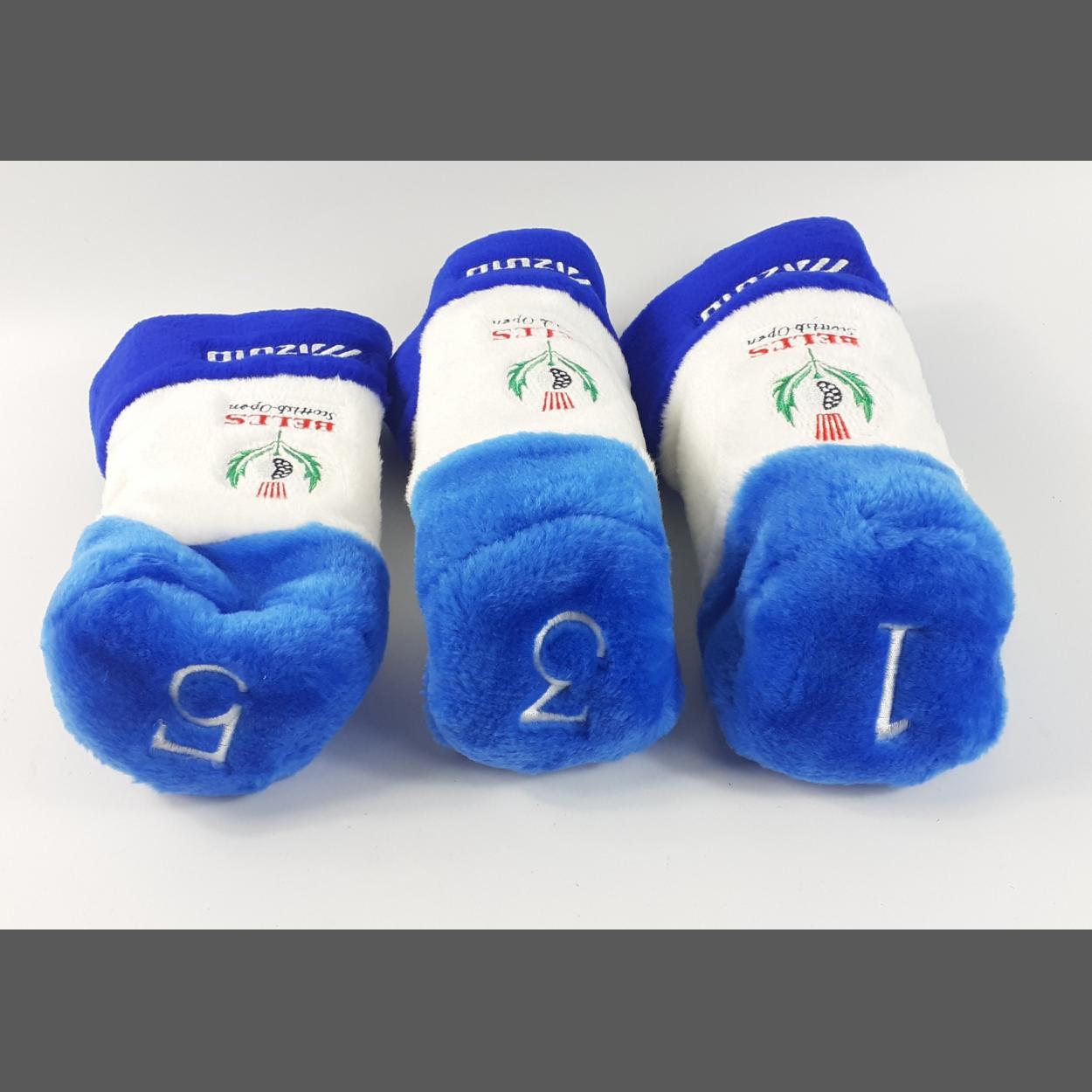 A set of 3 commemorative sportswear BELLS Scottish Open Mizuna club covers, numbers 1, 3 and 5.