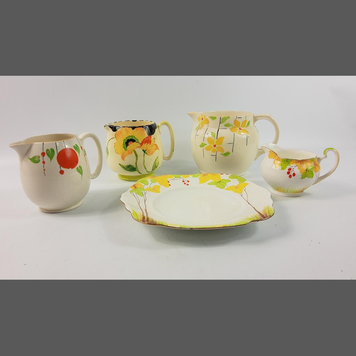 A pair of hand-painted vintage jugs (14cm and 12cm tall) plus one by Crown Devon (12cm tall) and a GRAFTON china jug (9cm tall) and sandwich plate