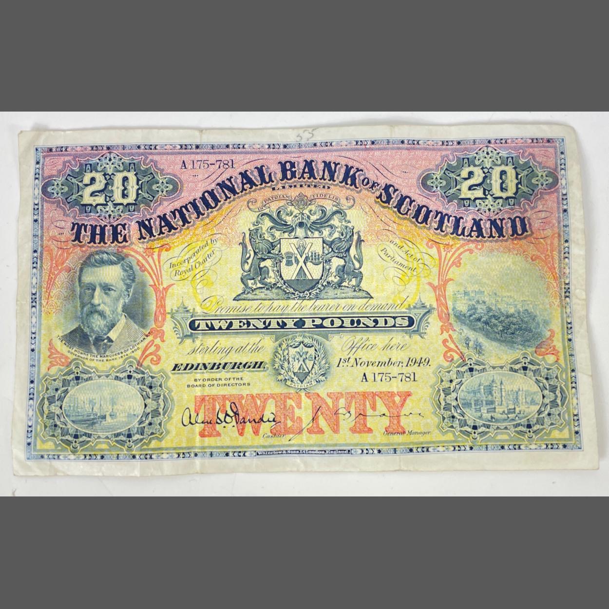 HIGHLY COLLECTIBLE! THE NATIONAL BANK OF SCOTLAND TWENTY POUNDS NOTE 1949 serial No A175-781in good condition - it has been folded once lengthwise, and twice height-wise, with no rips or tears - dimensions 21cm x 13cm approx