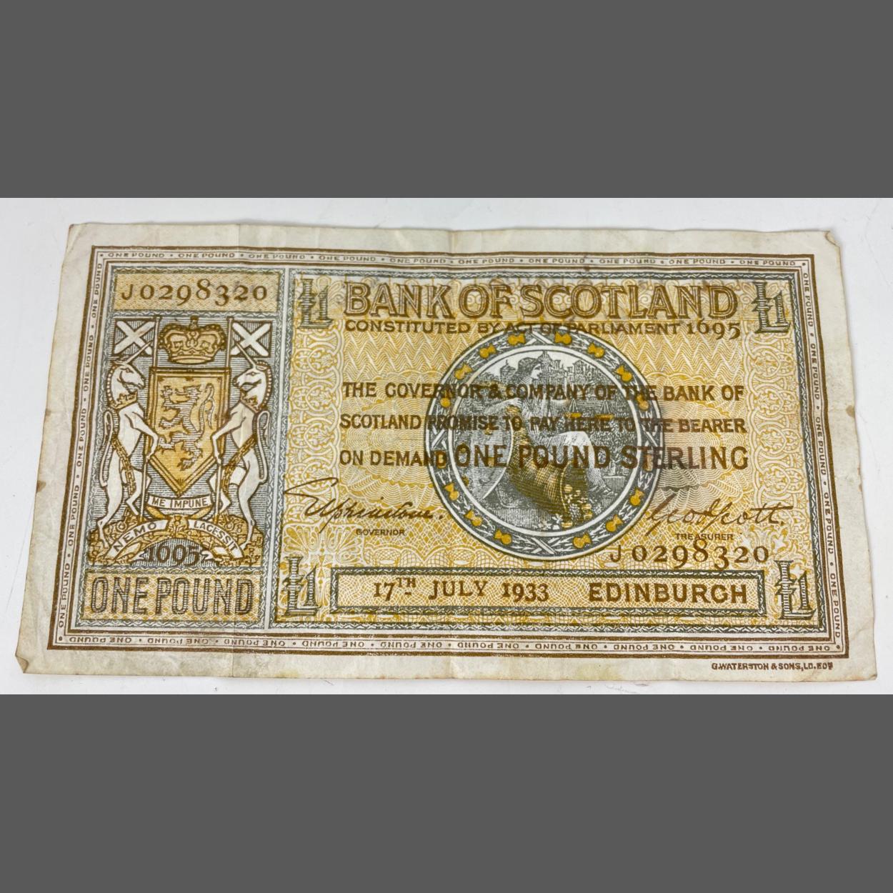 QUITE RARE! BANK OF SCOTLAND £1 BANK NOTE, EDINBURGH 17th JULY 1933 serial No J 0298320 with four folds, once lengthwise, and three times heightwise - no rips or tears -two corners have small fold marks in them - this banknote has been written on in fountain pen ink for a birthday in 1935