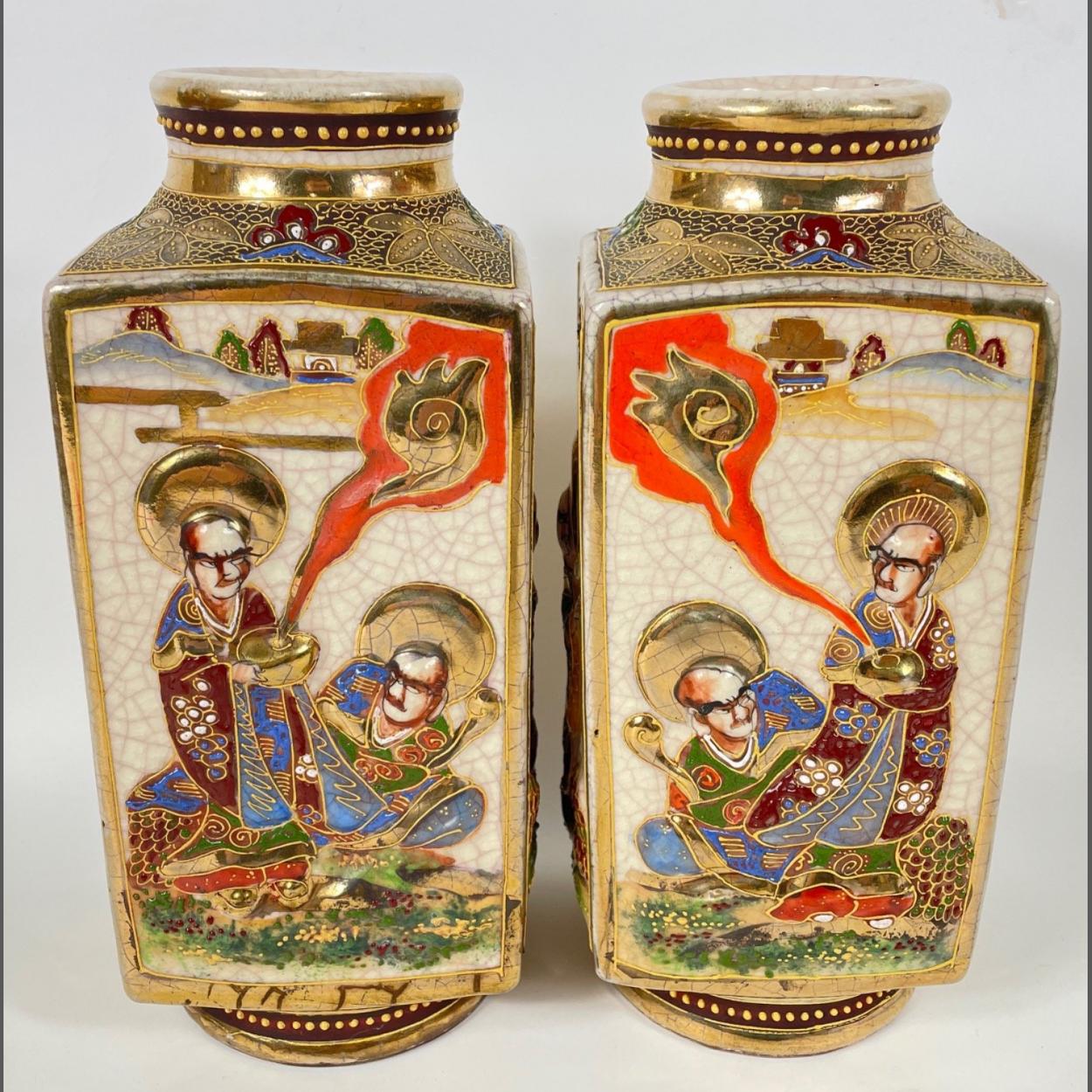 A pair of square-shaped Oriental vases with a raised decoration of scholarly gentlemen each 23cm high