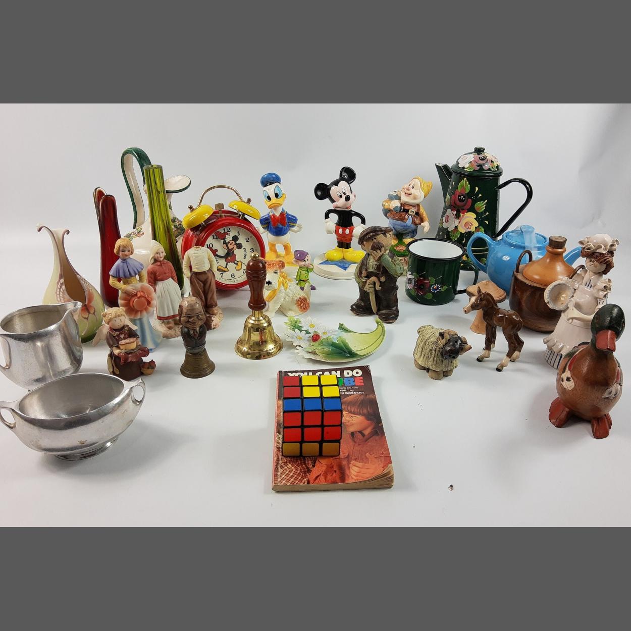 A LARGE LOT of various collectible ceramics including Disney, 2 coloured glass vases and a HCF LONDON figure vase as well as a wooden music box.