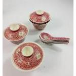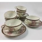 An Oriental spring blossom design eggshell tea service with geisha's face visible in base of cups comprising 6 cups (1 with hairline crack), 6 saucers (1 small chip, 1 crack repaired), 6 plates (17cm dia), 1 milk jug, 1 tea kettle with strainer but no lid, plus 4 red soup bowls, 3 with lids and six spoons