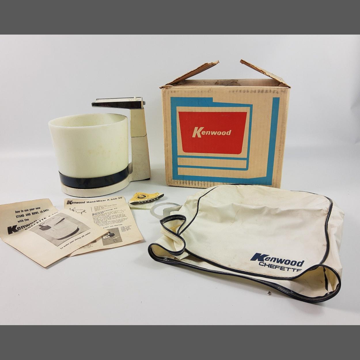 A retro KENWOOD HAND MIXER A.340/30 complete with mixer, Kenwood bag, instructions and spare part all boxed. Mixer 16.5cm high, good condition. No plug