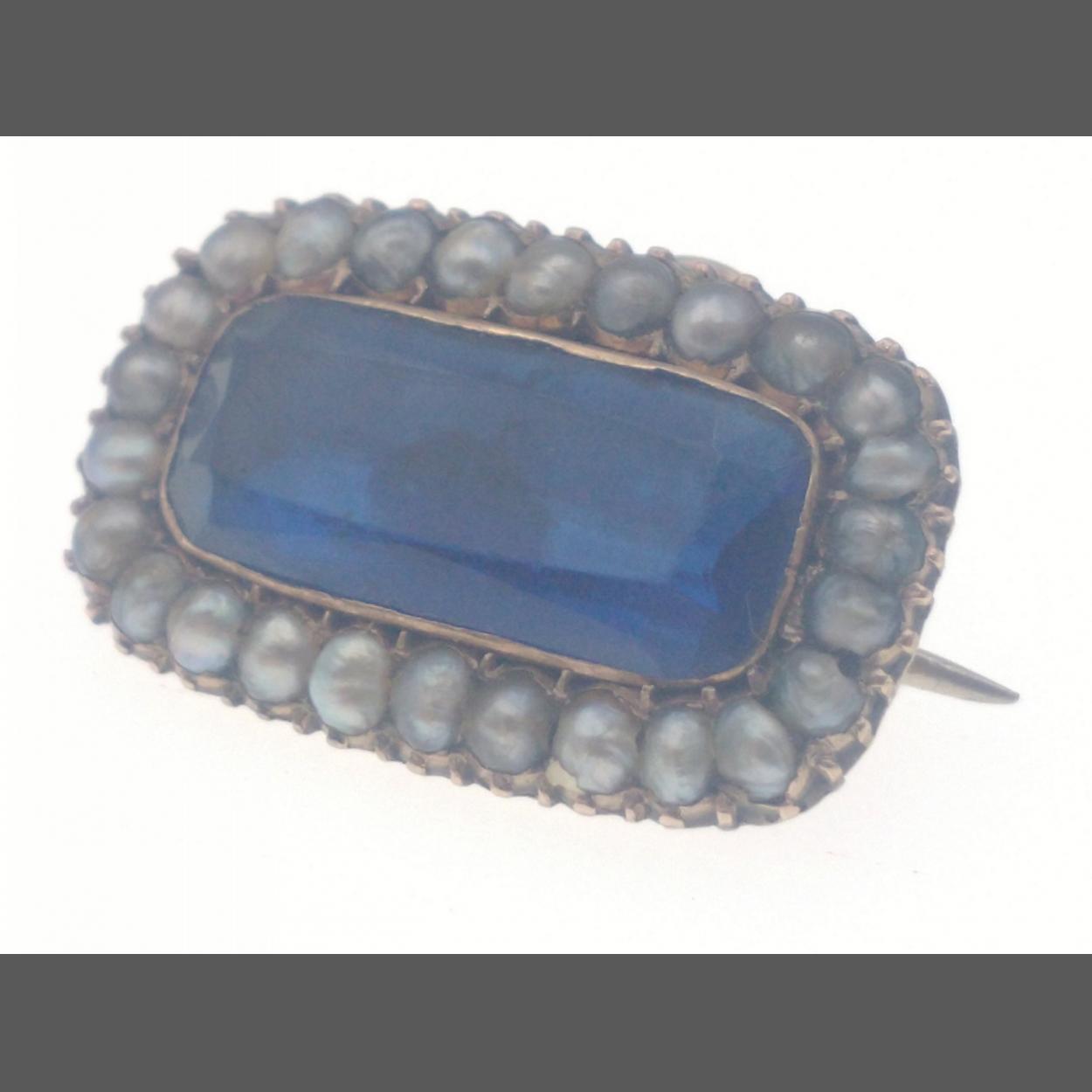 VINTAGE - Unmarked 'yellow metal' rectangular with blue stone and surrounded seed pearl - dimensions 2cm x 1cm - came from a beautiful - gross weight 3.41g approx