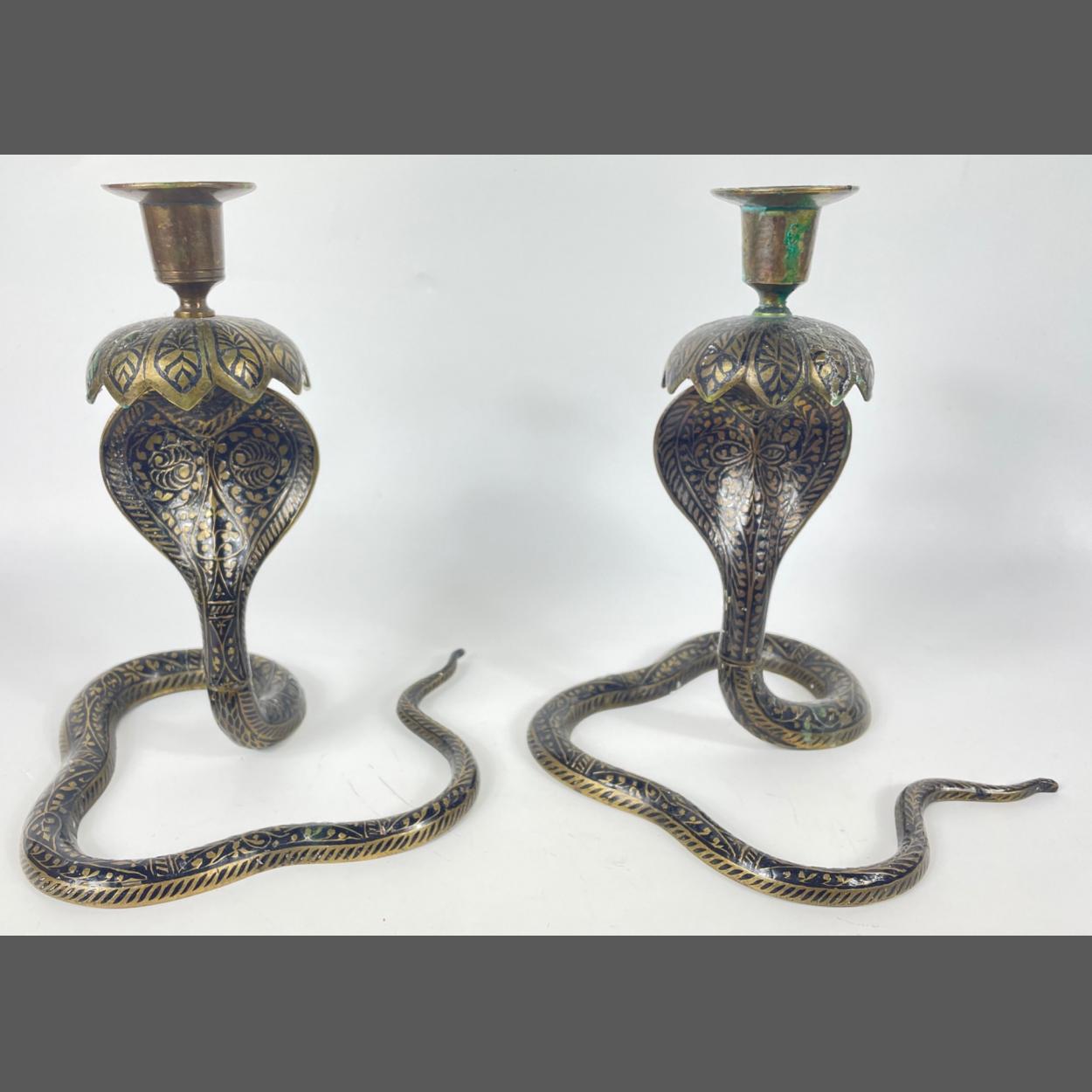 A pair of Indian brass candlesticks in the shape of cobras 21cm tall, base approx 14cm