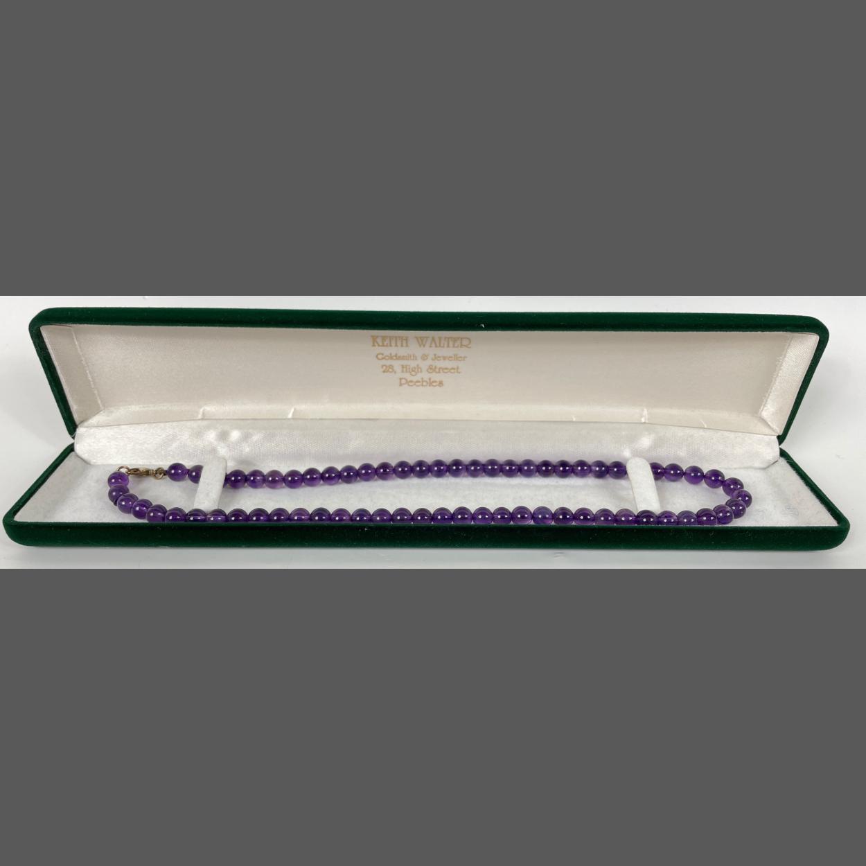 A string of amethyst beads with a 9K stamped lobster clasp, 38cm long