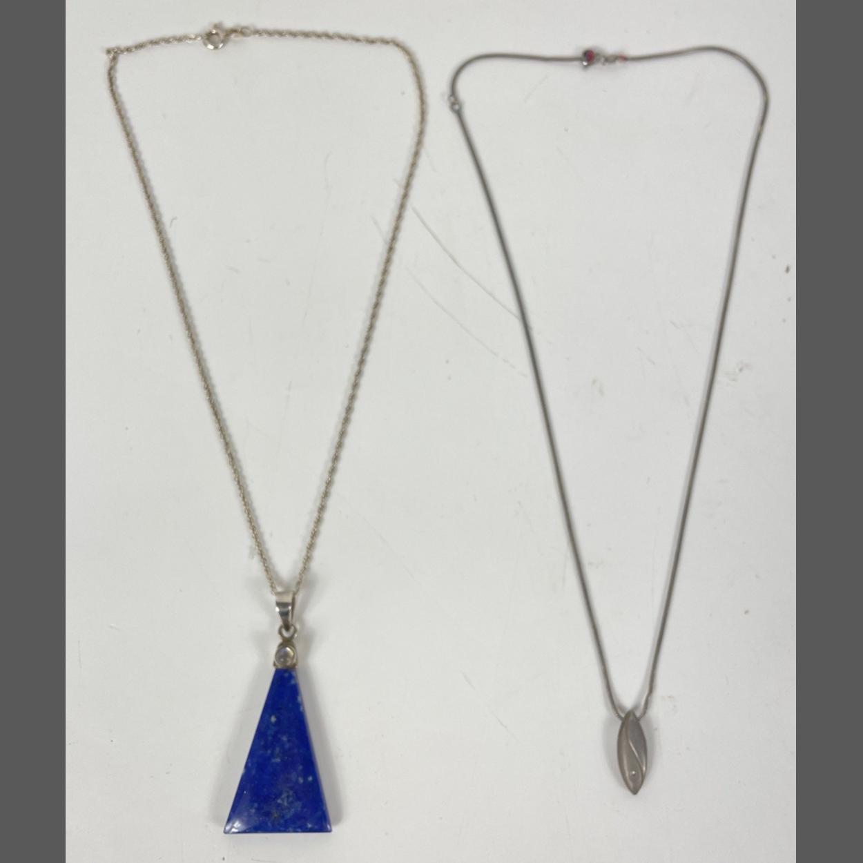 Two 925 stamped pendant necklaces, 1 set with triangular lapis lazuri and the second with small oval set hot diamond gross weight 16.40g