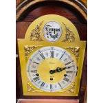 TEMPUS FUGIT small modern grandmother floor standing clock in dark wood case with pendulums and a nice brass effect clock face - dimensions height 150cm x width 28cm x depth 33cm approx - nice condition!