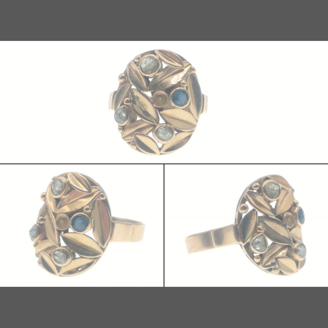 A 585 stamped yellow gold ring set with 3 old-cut diamonds and a sapphire (1 stone - possibly pearl missing) size M (? as band is mis-shapen), gross weight 5.58g