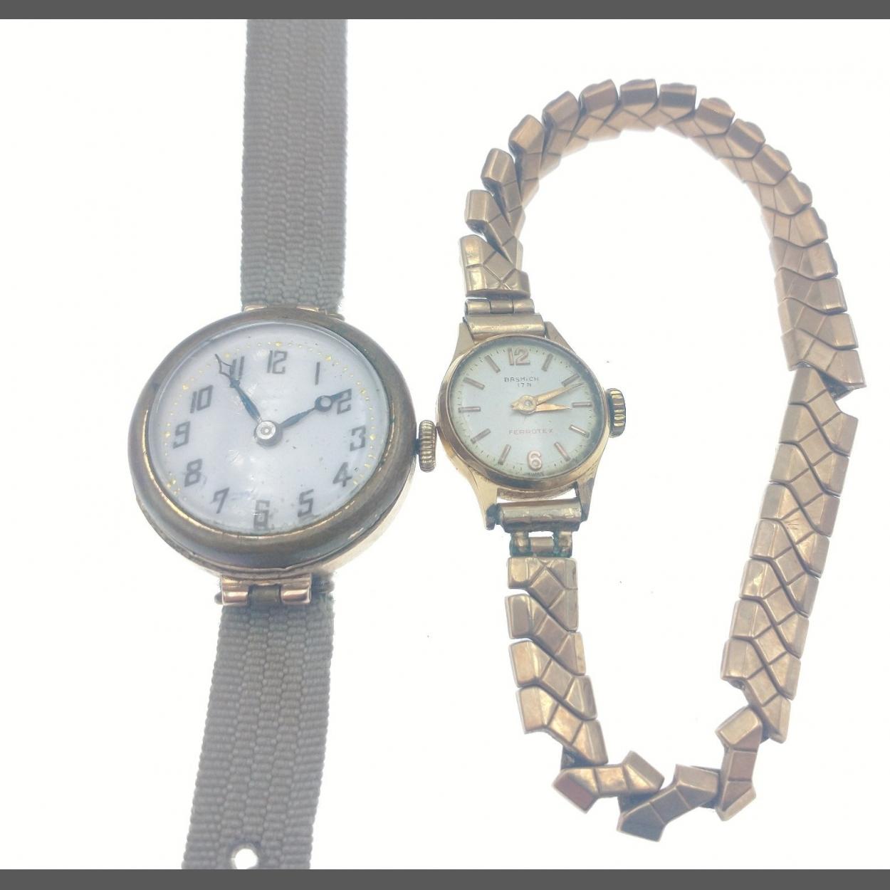 A 375 stamped watch case, the front ring is not gold (has been replaced) gross weight 16.20g, also a BASMICH ladies watch 18K 0.750 stamped on back, gross weight 15.50g