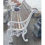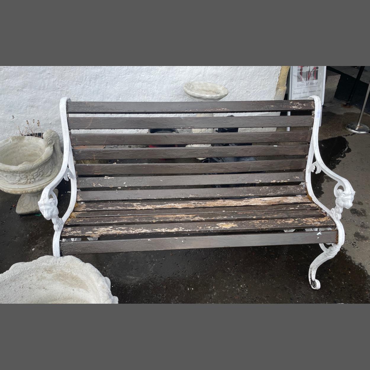 A BEAUTIFUL CAST IRON slated sided garden seat for two - to include feature LION HEADS - height 80cm x length 106cm x 60cm depth approx - one slat requires a repair