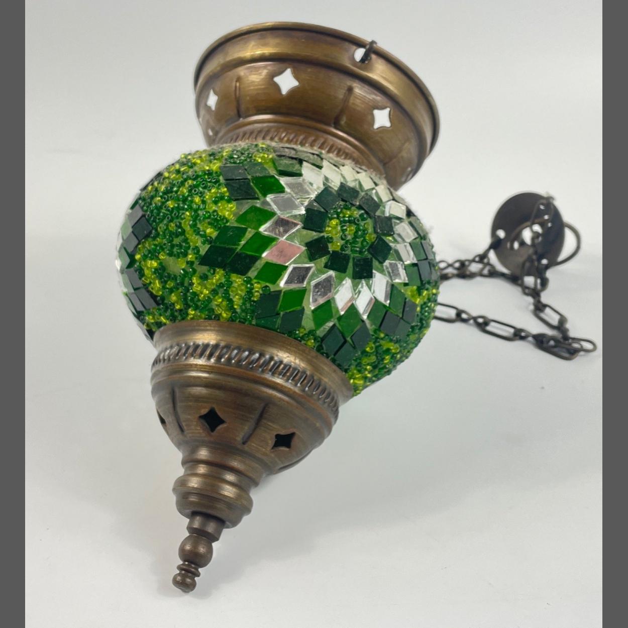 A Middle Eastern hanging tealight holder with a green beaded surface and mirror glass pattern approx 20cm high plus chain of 30cm,