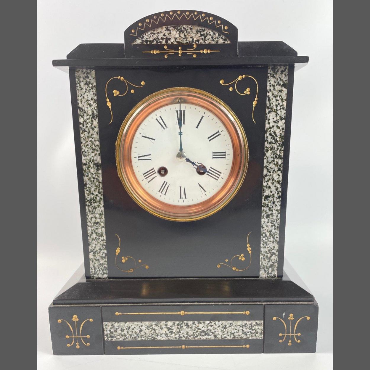 An ANTIQUE black marble mantel clock. Dimensions - 25.7cm at base, 28cm tall. Good condition