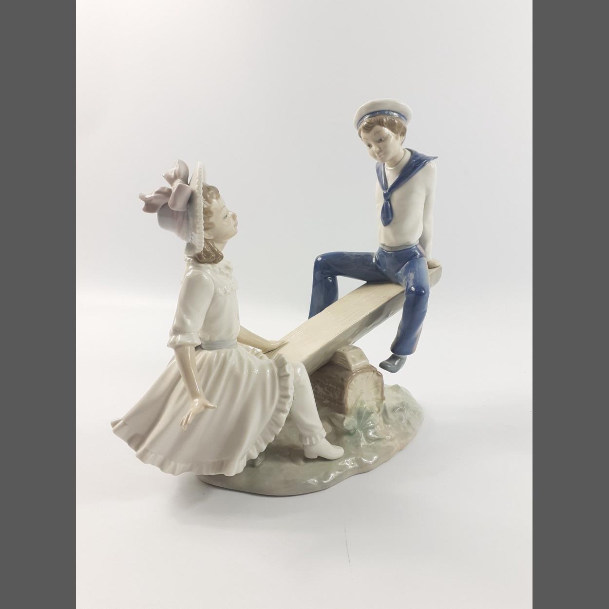 A large LLADRO figure group of a boy and girl on a swing standing 25cm tall, 24cm long, no visible damage