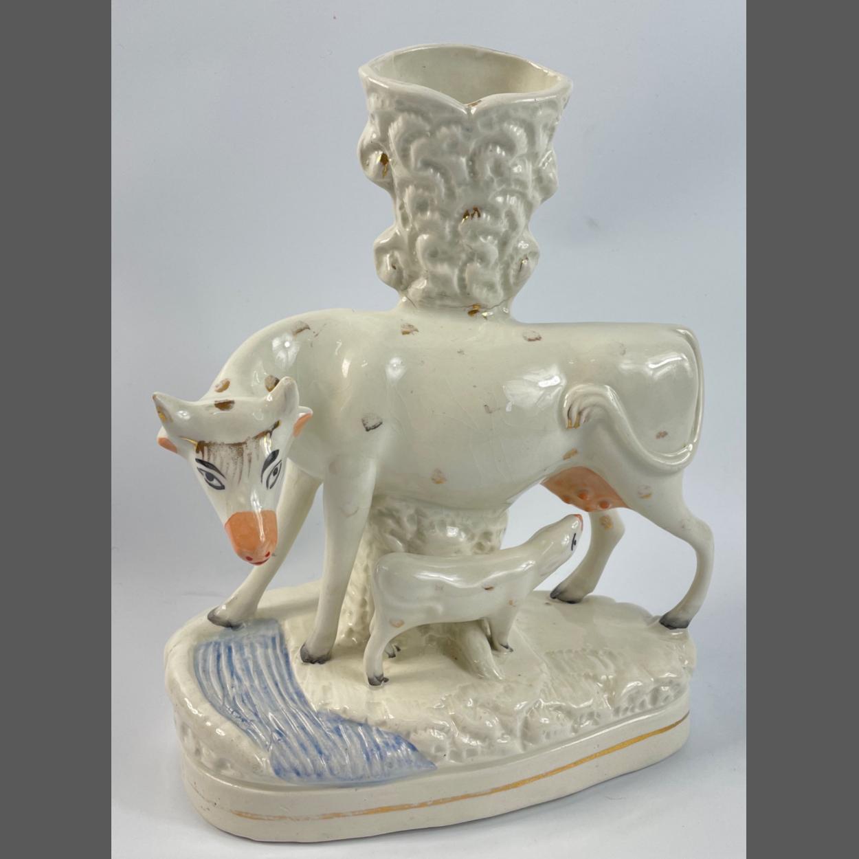 Staffordshire spill vase with cow and calf, stands approx 30cm, width approx 20cm