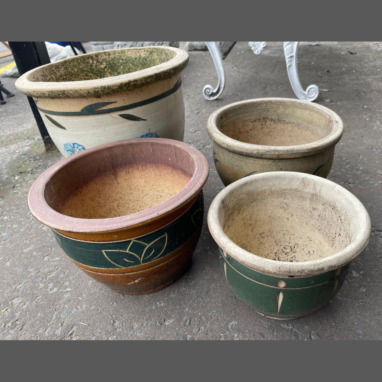 A collection of four ceramic garden containers in varying sizes, the largest one height 32cm height x 38cm diameter, alas the large one has a crack down it but is intact, all other three pots are intact and 'good to go'!