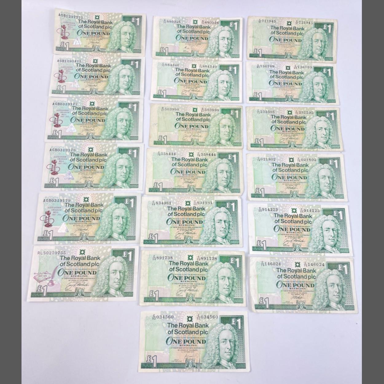 also RBS plc ROBERT LOUIS STEVENSON £1 SEQUENTIAL notes x3 Qty Serial No's AGB0319177-79 - also a RLS £1 note with serial No starting RL - and also x2 Qty ALEXANDER GRAHAM BELL 3rd March Issue - in very good condition
