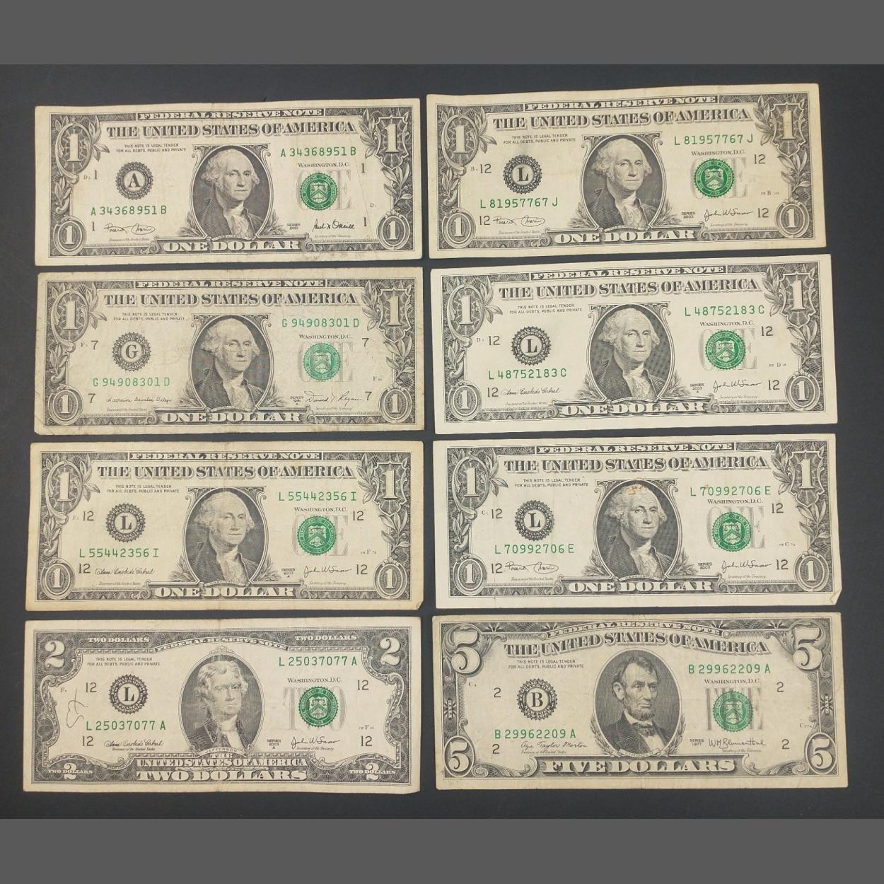 UNITYED STATES OF AMERICA - AMERICAN DOLLAR Notes to include 4 $1 DOLLAR series A 2003 banknotes, in circulated condition, with also a $2 DOLLAR series A 2003 banknote, also a 1977 Series $5 DOLLAR Banknote in circulated condition, with also a 1981 Series A $1 DOLLAR Banknote in circulated condition and finally a 2001 Series $1 dollar again in a circulated condition