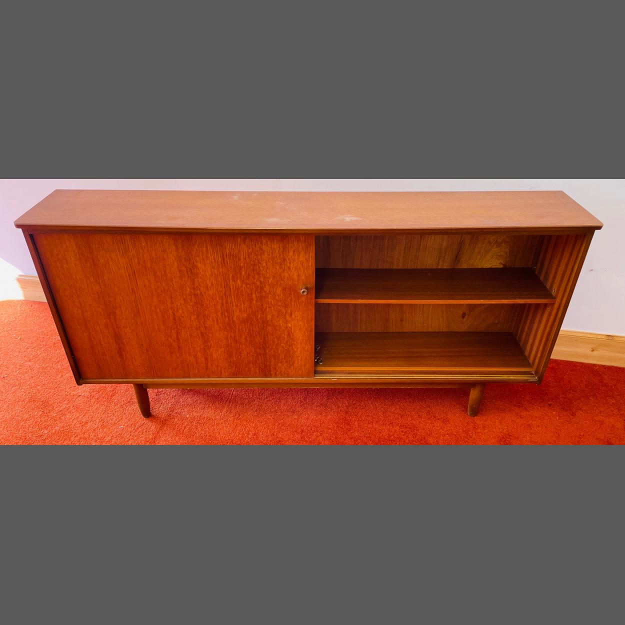 A BEAUTIFUL RETRO FLOOR BOOKCASE in teak with a glazed door and a sliding teak door - - dimensions 155cm length x 28cm depth x 75cm height approx