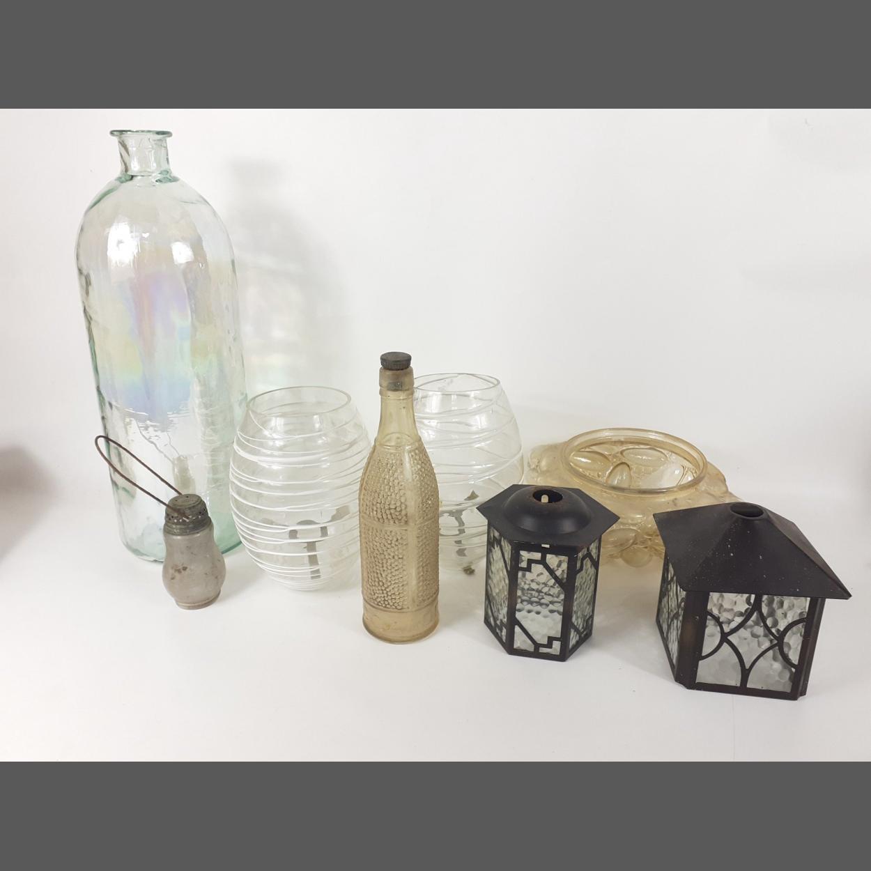 A large mixed lot of glass to include a very large bottle/vase 50.5cm high, an interesting vintage 'pressed-glass'ceiling light 13cm in height, 4.5cm wide, a 'LUCOZADE' bottle complete with stopper 30cm high, two cylindrical wall hangings 24cm high, a small hanging bulb 22.9cm high with handle raised and two decorative lanterns, both 6cm high. Condition - All in good condition.
