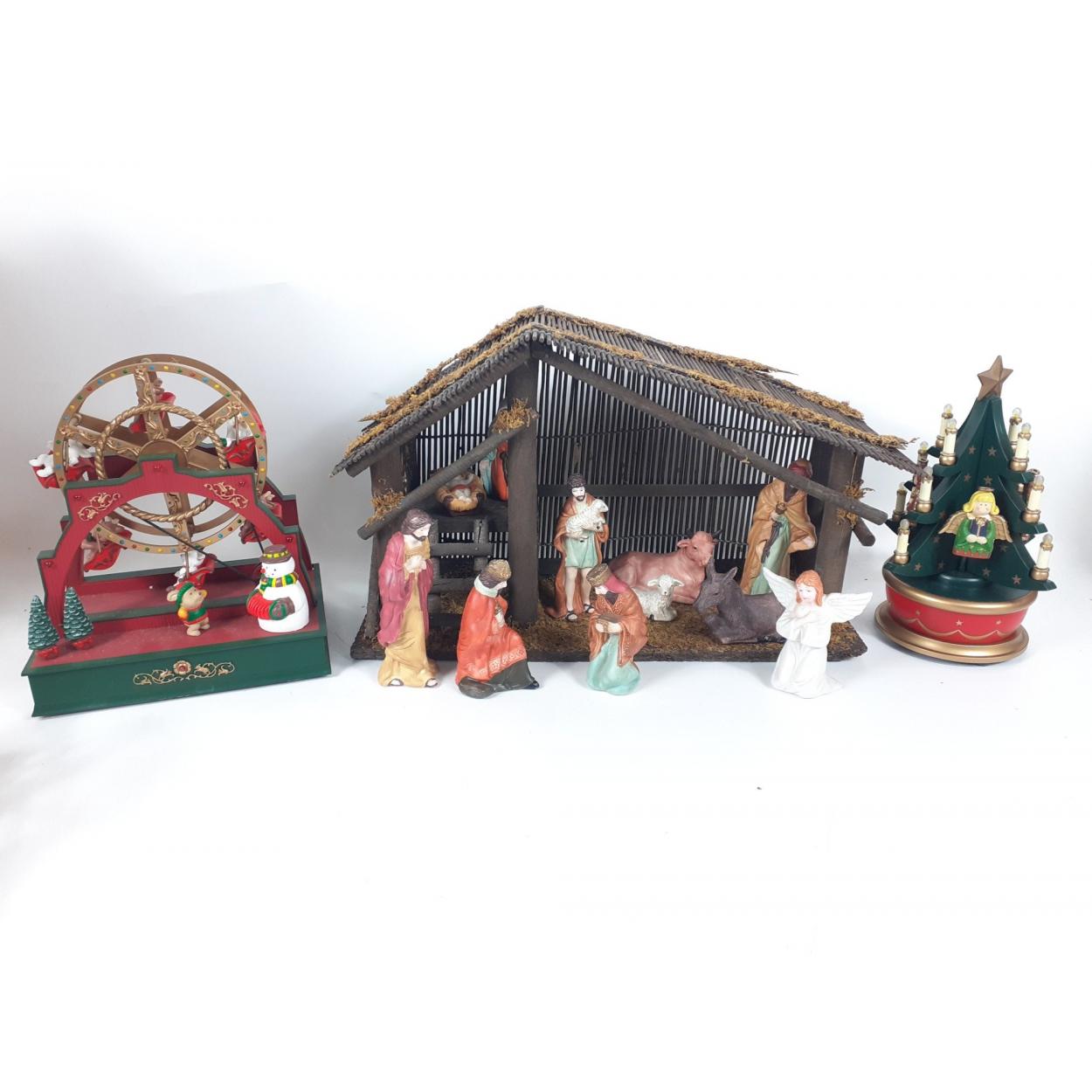 Beat the Christmas rush - a wooden nativity scene 40x25cm approx with all the appropriate figures plus from AVON COSMETICS - a musical Angel Christmas Tree, a Musical Ferris Wheel and a Frosty Folks Band