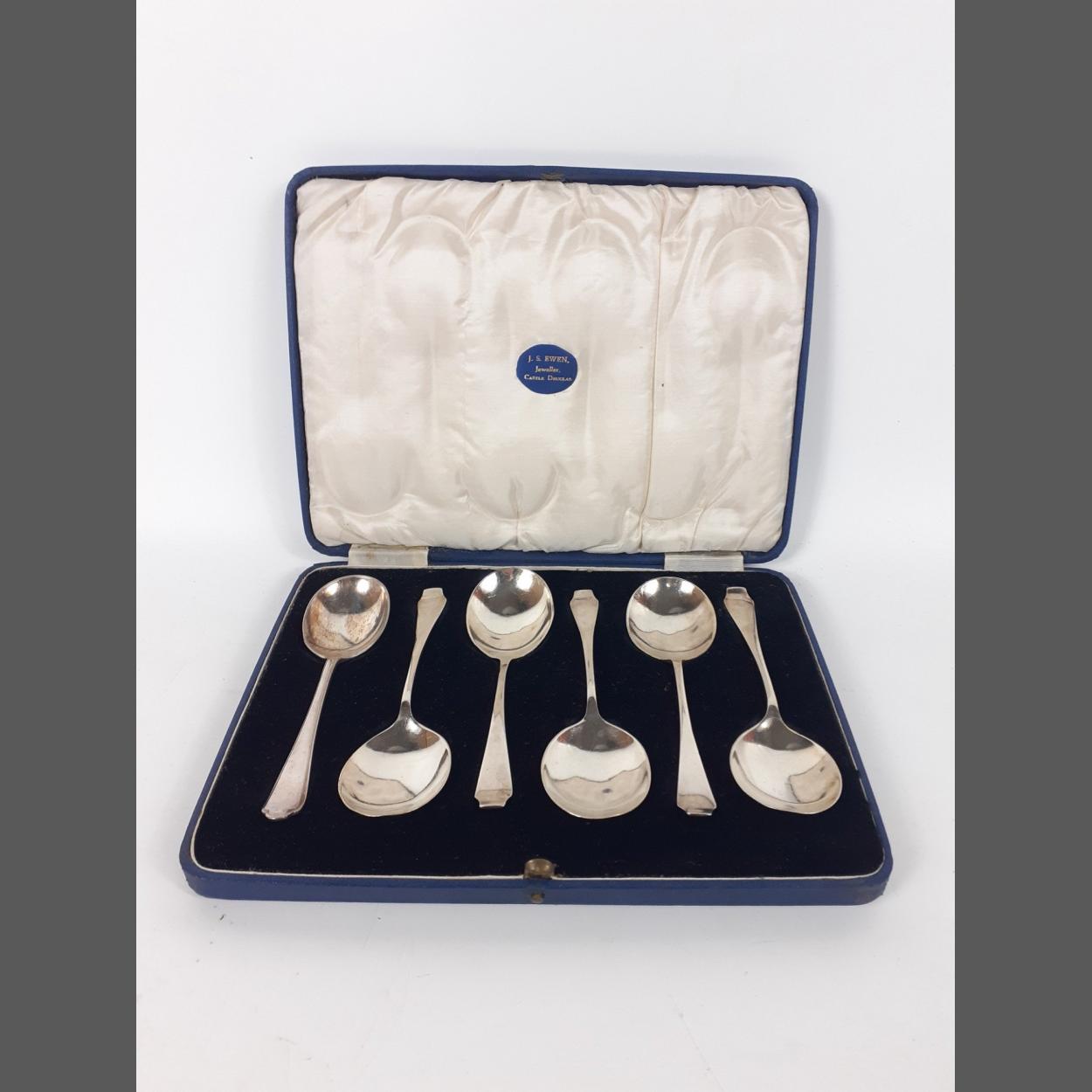 A boxed set of six silver hallmarked bouillon spoons made in Sheffield 1932 by John Sanderson and son, weight 144g