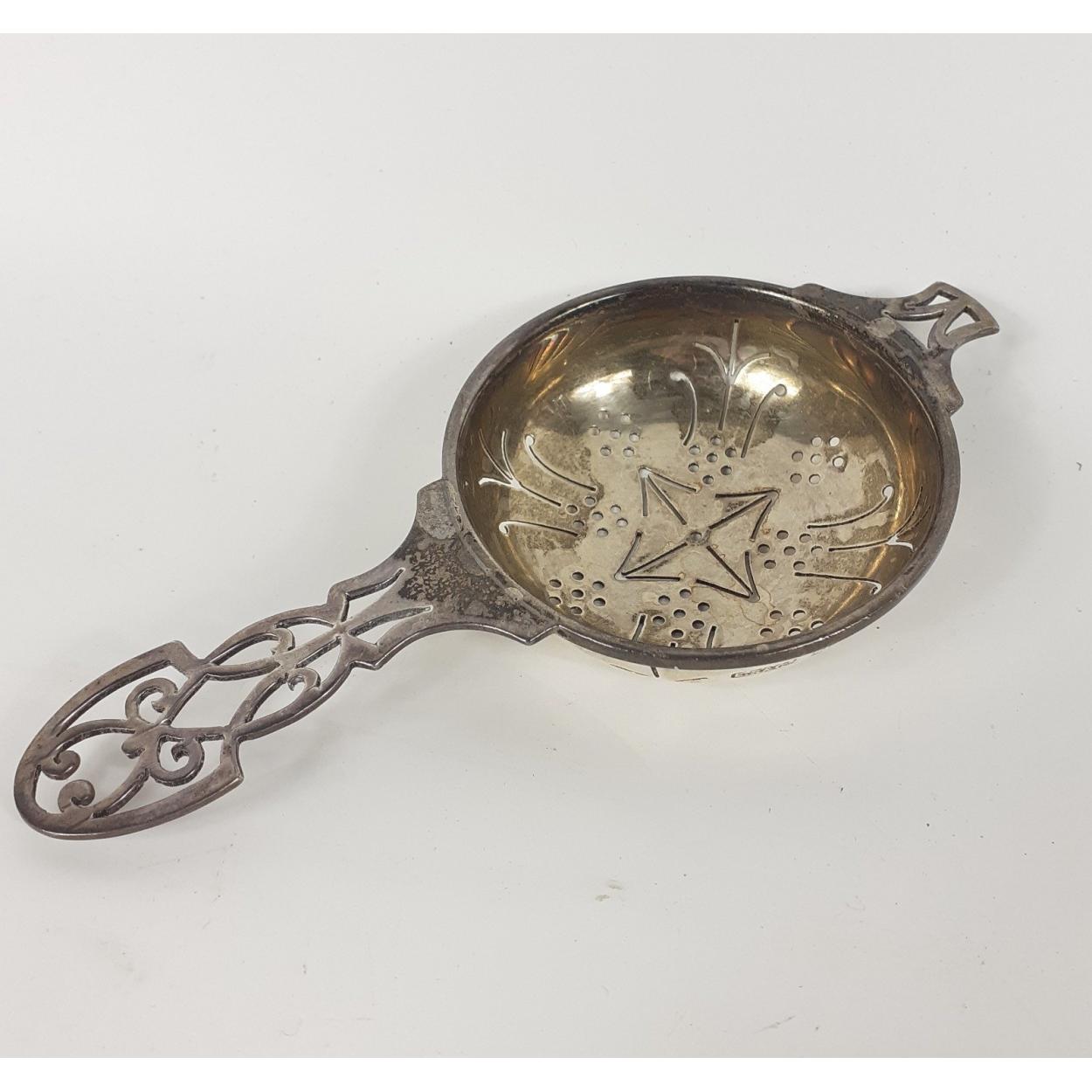 A small silver hallmarked tea strainer with drip cup, Sheffield 1947, by E Silver and Co weight 94.50g