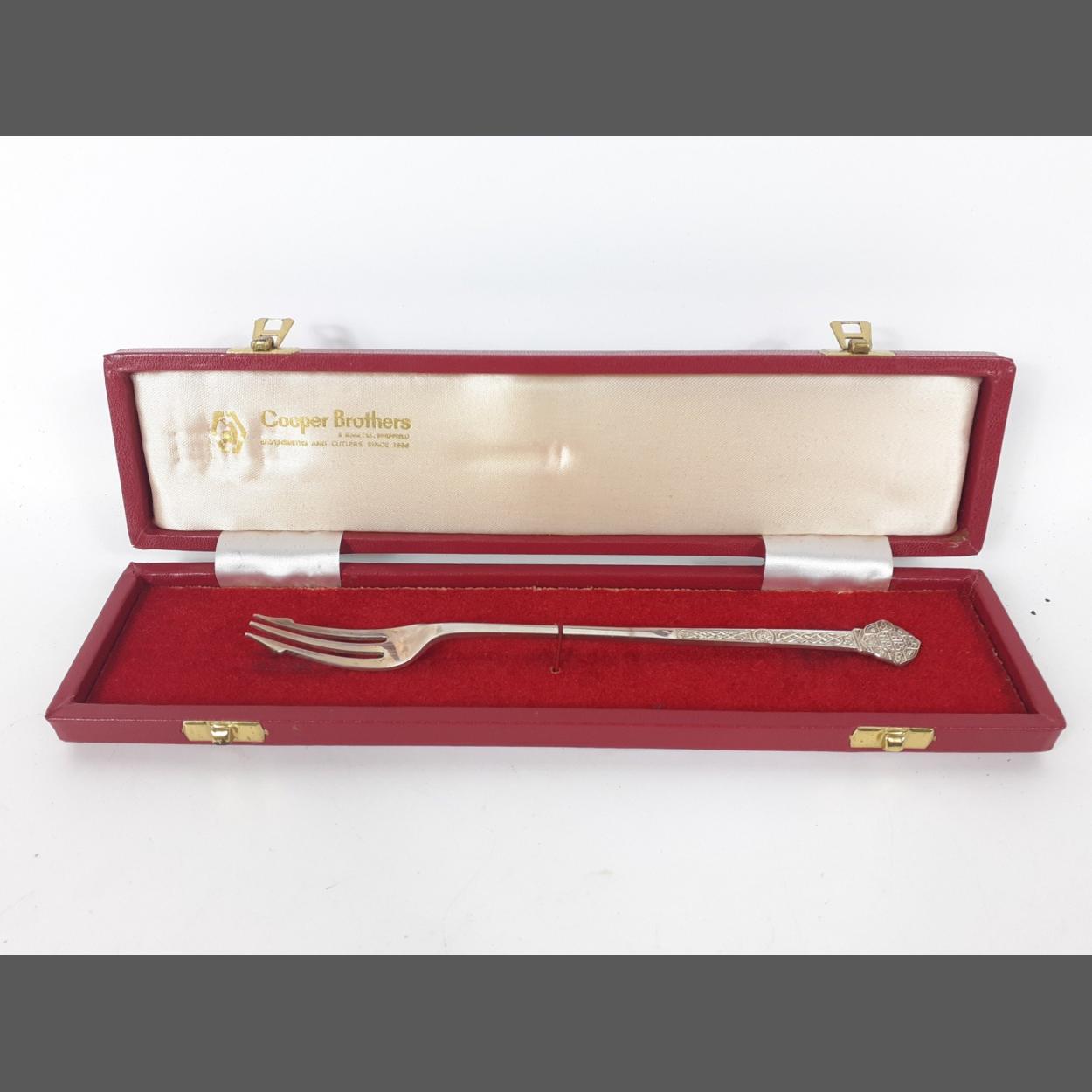 A silver hallmarked pickle fork in presentation box, Sheffield 1977, by George Bishop and sons weight 25.50g