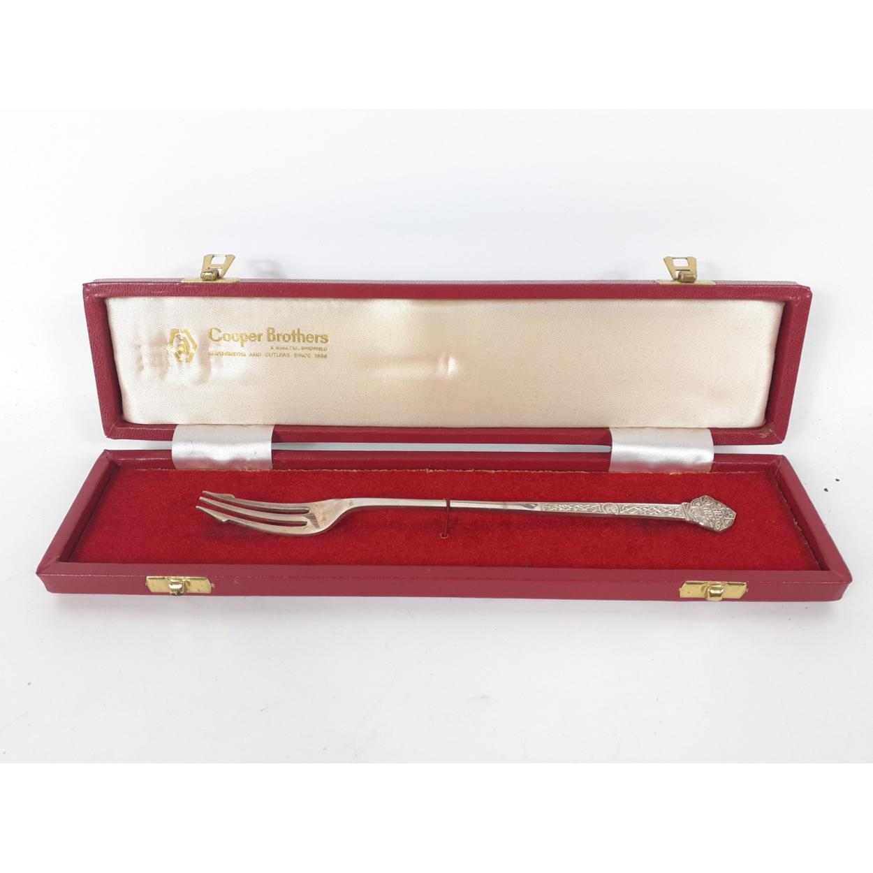 A silver hallmarked pickle fork in presentation box, Sheffield 1977, by George Bishop and sons weight 25.50g