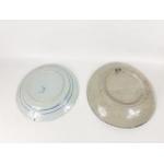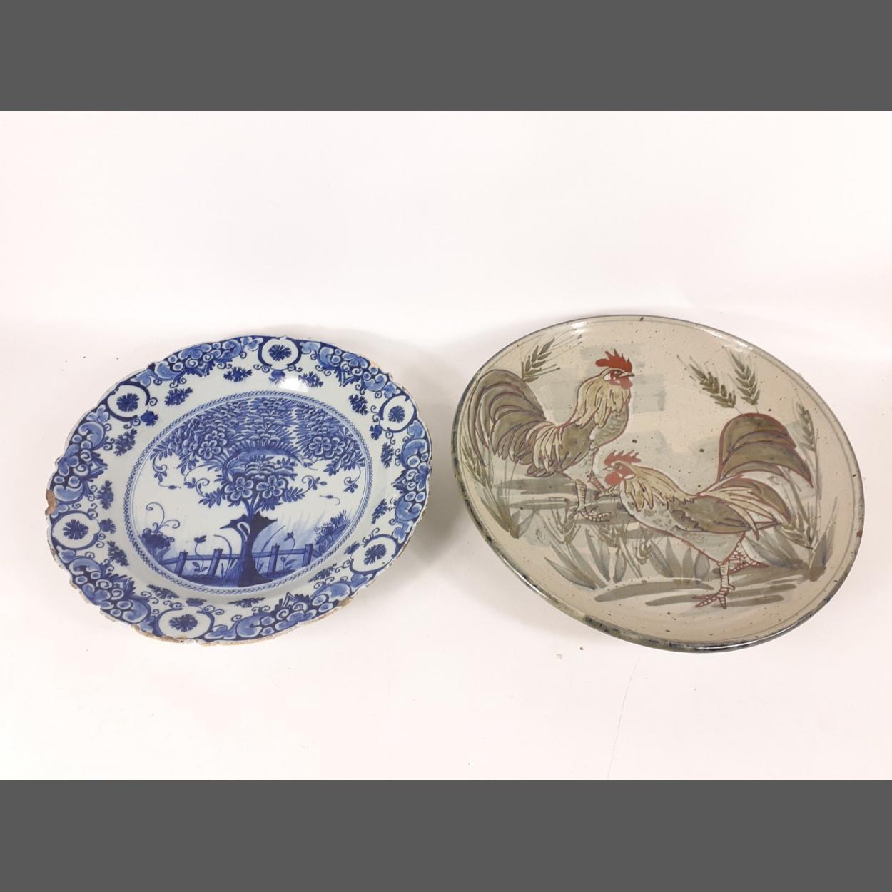 An impressive studio pottery platter with a design of two cockerels, 35cm dia approx, plus an aged blue and white platter 35cm dia with age related damage